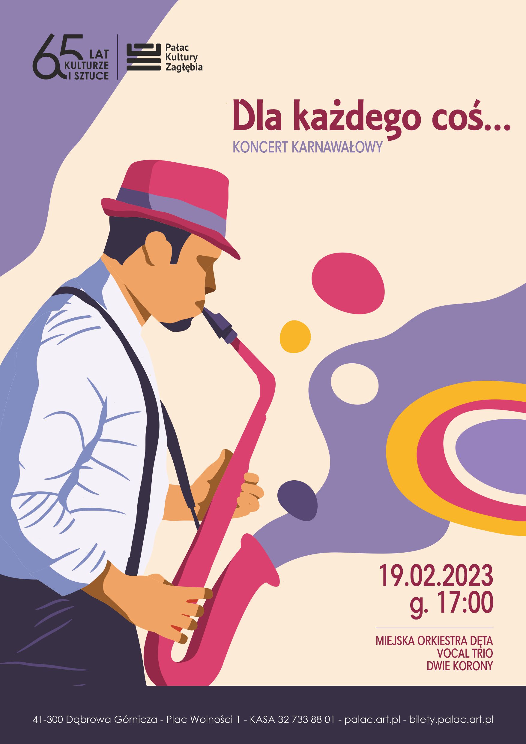 19 lutego o godz. 17:00 zapraszamy do Sali Teatralnej Pałacu Kultury Zagłębia na Koncert Karnawałowy w wykonaniu Miejskiej Orkiestry Dętej oraz zespołów Vocal Trio i Dwie Korony.