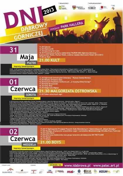 W sobotę pod naszą scenę zapraszamy miłośników muzyki spod szyldu pop-rock. W tym dniu oprócz muzyki Rafała Brzozowskiego, którego hit "Tak blisko" przez kilka miesięcy nie schodził z pierwszych miejsc list przebojów zobaczymy i usłyszymy Małgorzatę Ostrowską. Na koncercie w Dąbrowie Górniczej wokalistka legendarnego zespołu Lombard zaśpiewa swoje najnowsze produkcje m.in. utwór pt. "Po niebieski niebie", który skomponował Marek Jackowski (ex-Maanam) jak również starsze przeboje.