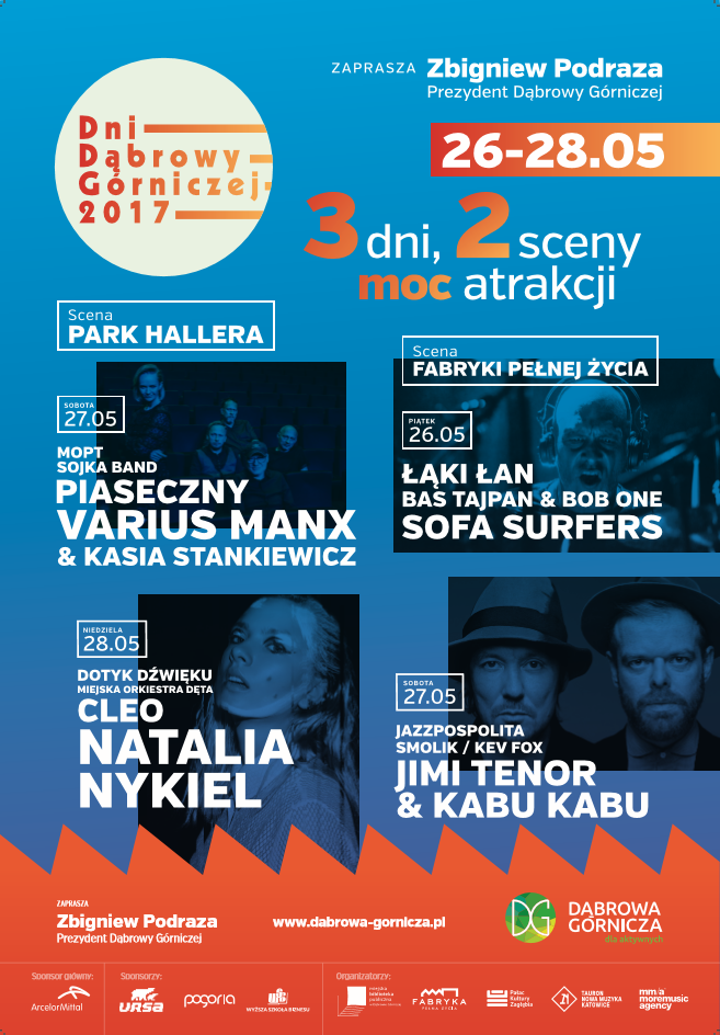 Mało? Ok, dorzucamy do tego drugą scenę w Parku Hallera z muzycznymi gwiazdami w rolach głównych, wesołe miasteczko oraz pakiet atrakcji przy parkowych alejkach i mamy gotowy przepis na największą majową imprezę w całym Zagłębiu Dąbrowskim. Specjalnie dla Was, w 3 majowe dni (26-28.05.2017), zaprezentujemy przede wszystkim najlepszą muzykę i niebanalnych artystów, zadbamy o świetną atmosferę. Nie zabraknie też lokalnych akcentów. Scena Fabryki Pełnej Życia, w piątek i sobotę, promieniować będzie niepowtarzalną energią, pełnymi temperamentu muzycznymi gwiazdami i emocjami. Park Hallera wybrzmi przebojami najpopularniejszych polskich artystów w sobotę i niedzielę. Tutaj od soboty do niedzieli „królować” będą gwiazdy znane szerokiej publiczności z eteru, ekranów telewizora i aplikacji muzycznych. Nie zabraknie też młodych artystów z Młodzieżowego Ośrodka Pracy Twórczej, muzyków z Sojka Band i Miejskiej Orkiestry Dętej oraz uczestników projektu Dotyk dźwięku.