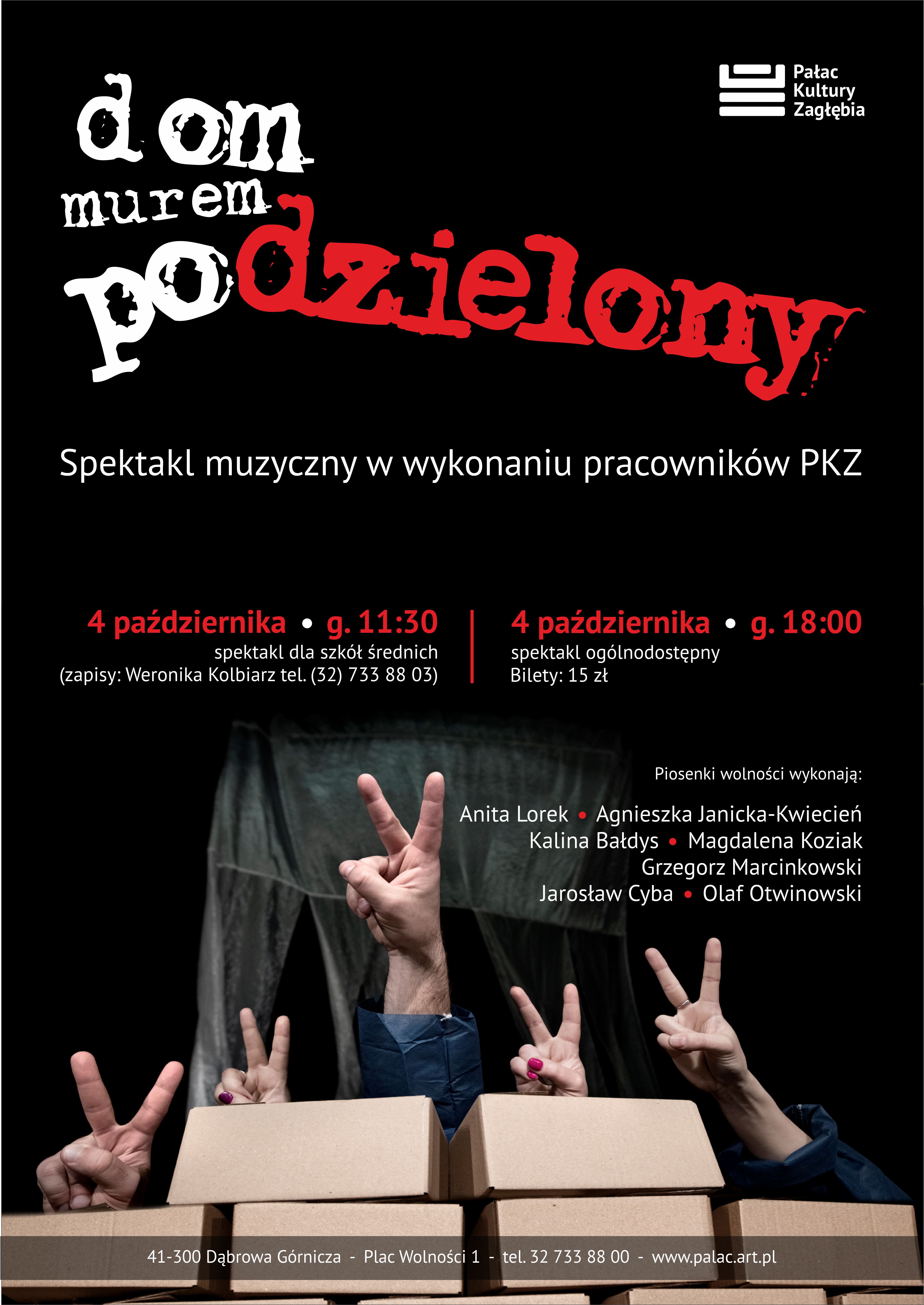4 października o 18:00 na głównej scenie Pałacu Kultury Zagłębia odbędzie się kolejna odsłona spektaklu muzycznego pt.: Dom murem podzielony w reżyserii Jarosława Cyby - w wykonaniu pracowników PKZ - z publicznością na scenie!