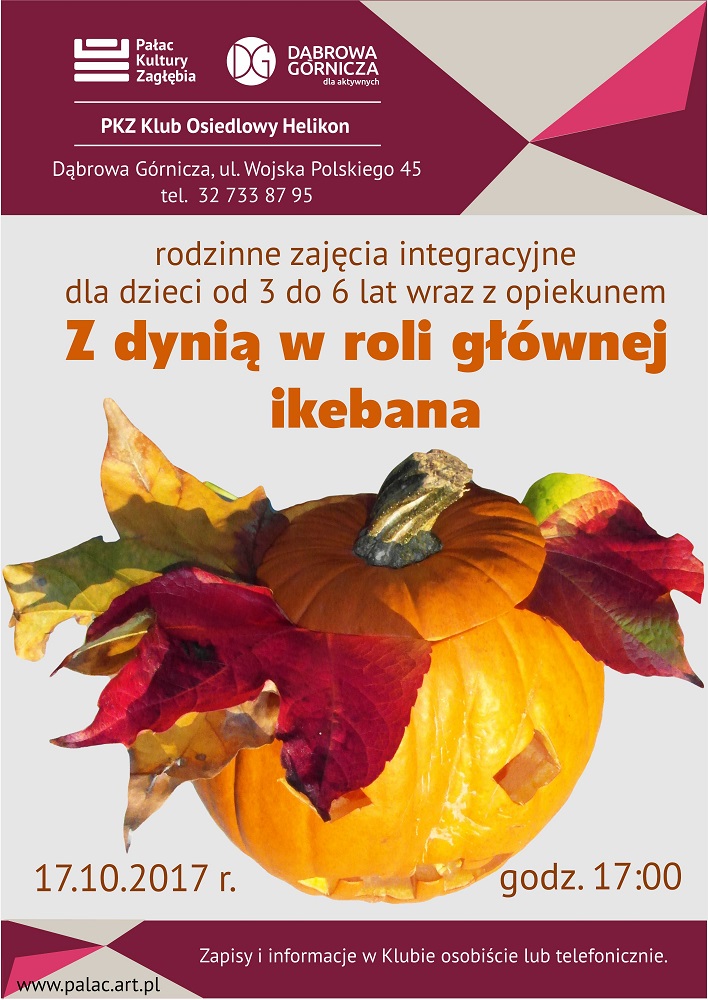 Dynia jest jak jesienne słońce, ma wiele zalet: poprawia nastrój swoim wyglądem, pysznie smakuje, może być ozdobą domu lub jako podstawa do jesiennego stroika. Klub Osiedlowy Helikon zaprasza dzieci w wieku 3-6 lat wraz z opiekunem do stworzenia własnej ikebany, której bazą będzie właśnie dynia. Zajęcia odbędą się 17 października o godz. 17:00.