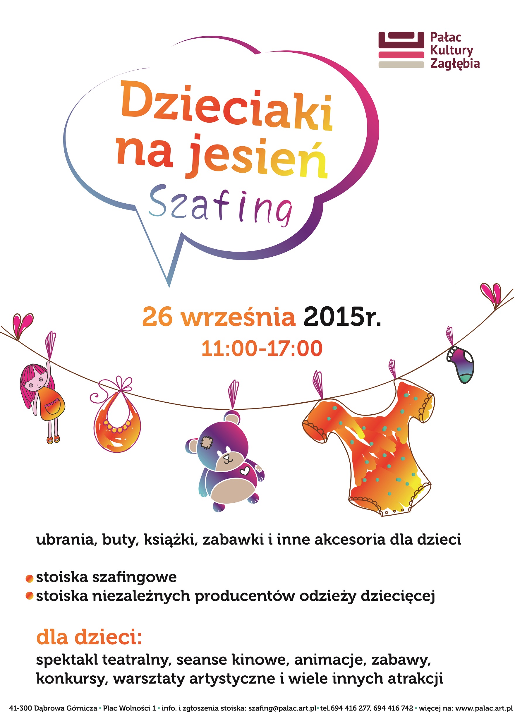 Dodatkowe informacje dla osób zainteresowanych zorganizowaniem stoiska ze swoimi rzeczami oraz dla firm odzieżowych: szafing@palac.art.pl; telefon: 694 416 277, 694 416 742.