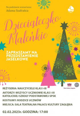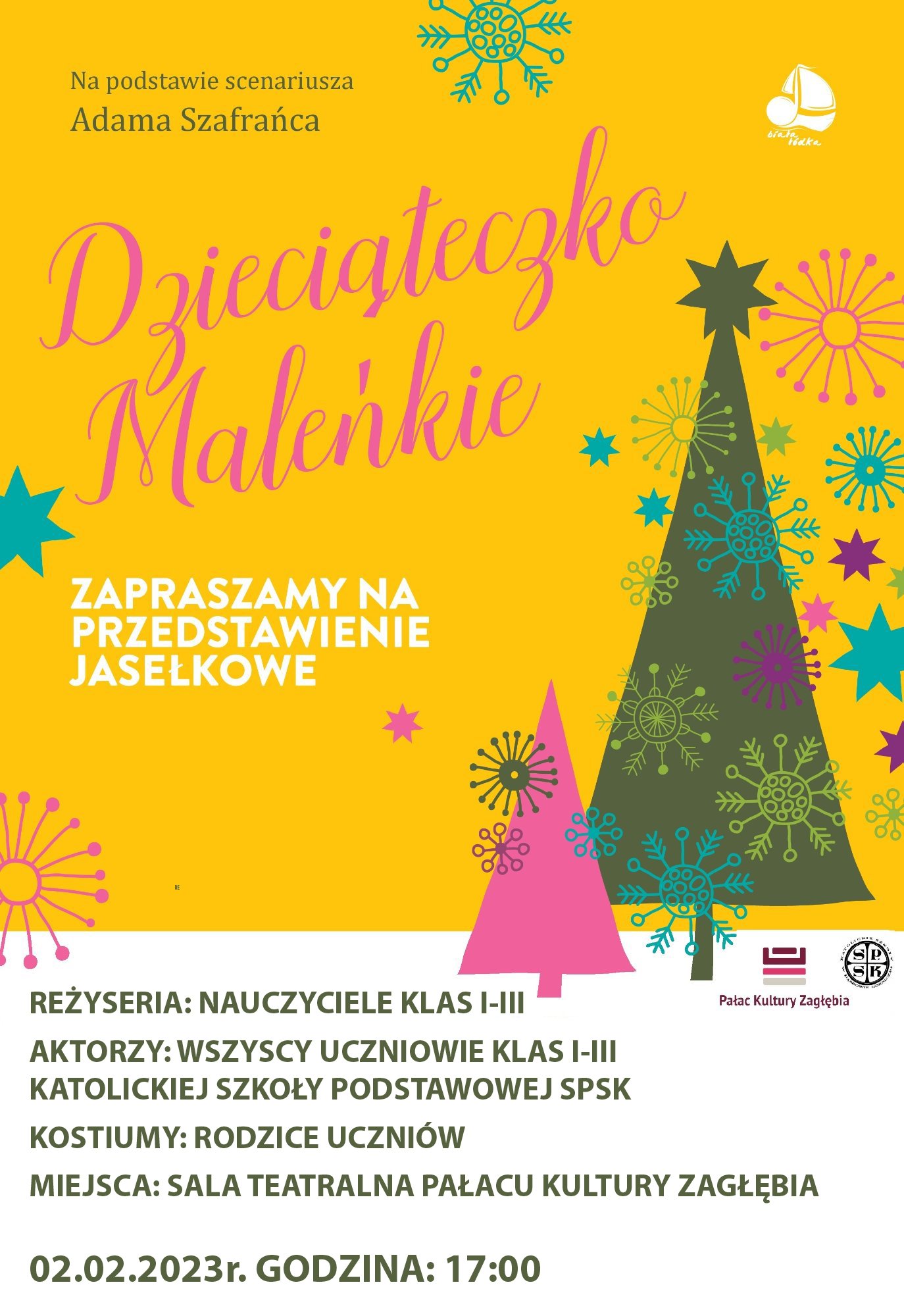 2 lutego o 17:00 wraz ze Szkoła Podstawową Stowarzyszenia Przyjaciół Szkół Katolickich zapraszamy na przedstawienie jasełkowe pt. Dzieciąteczko Maleńkie, które odbędzie się w Sali Teatralnej Pałacu Kultury Zagłębia.