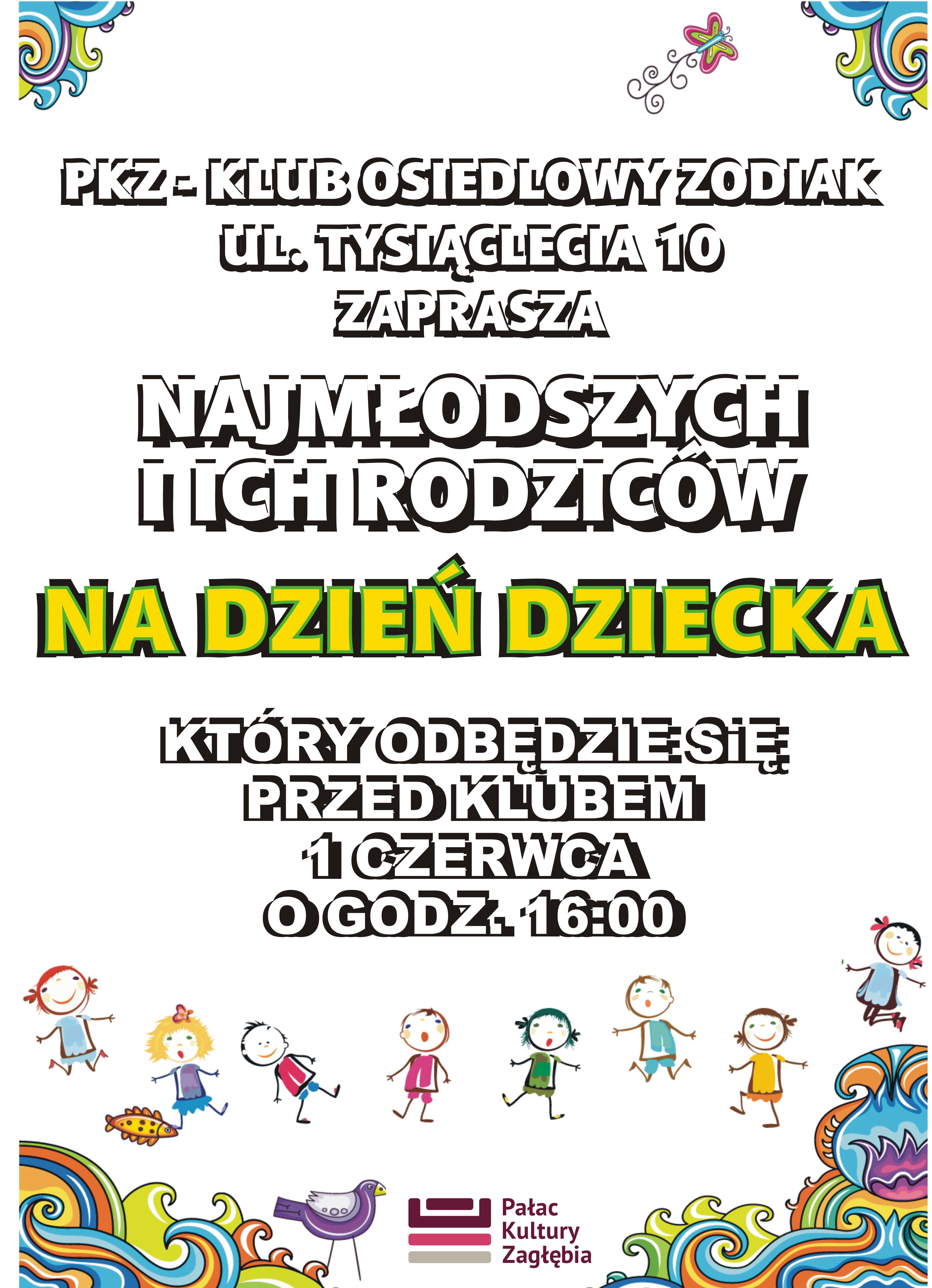 Zapraszamy najmłodszych i ich rodziców na festyn z okazji Dnia Dziecka, który odbędzie się 1 czerwca o godz. 16:00 przed klubem Zodiak. W programie warsztaty plastyczne, oraz wiele niespodzianek, zabaw i konkursów.
