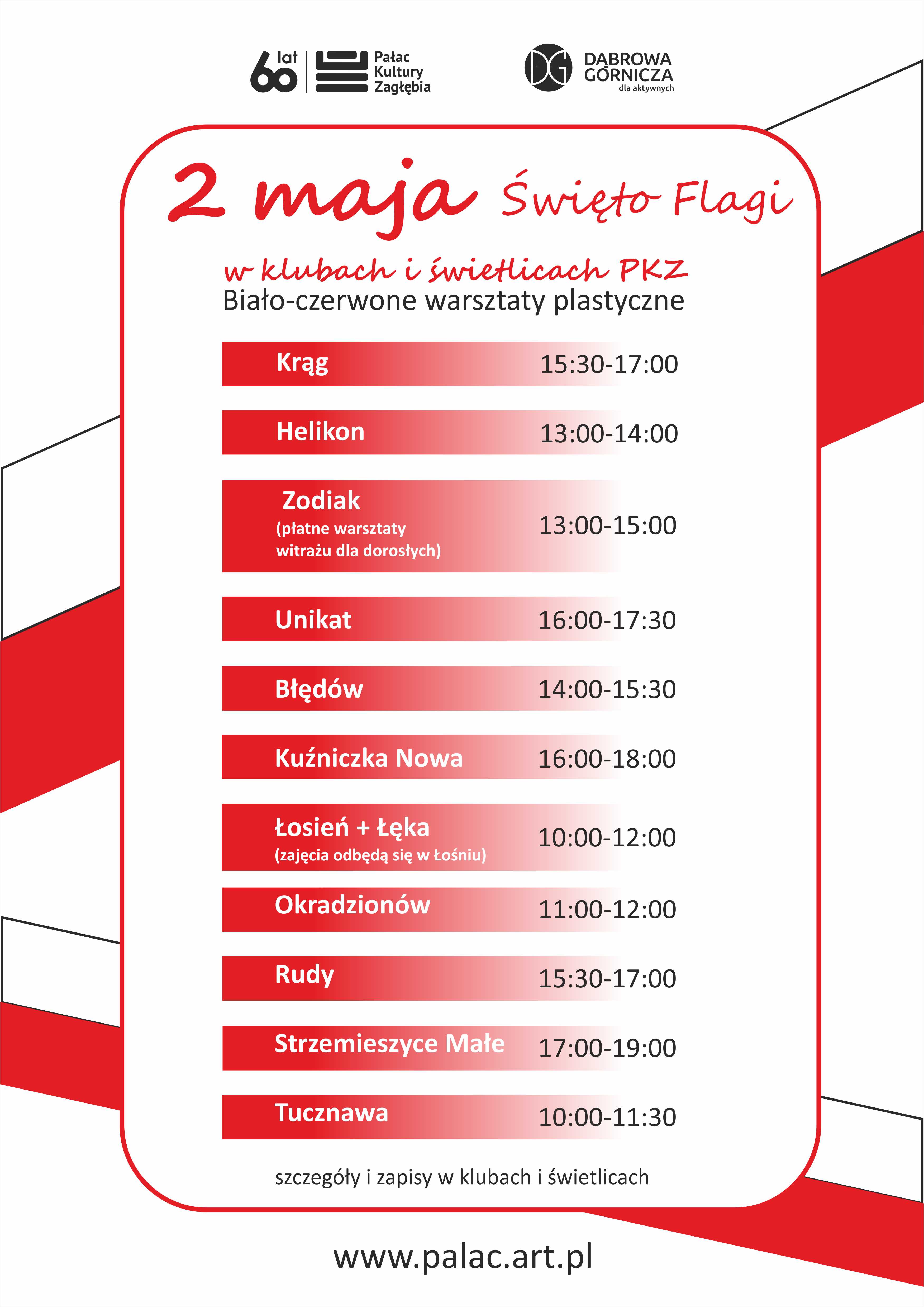 2 maja - Święto Flagi w placówkach Pałacu Kultury Zagłębia. Dzień, w którym mamy okazję skupić się na barwach narodowych i postawach patriotycznych. Biało-czerwona flaga to jeden z symboli naszego kraju, który jest z nami od dawien dawna i towarzyszy nam w najważniejszych momentach nie tylko państwowych, ale i przy wydarzeniach sportowych. Barwy naszej flagi symbolizują naszą państwowość, o którą musieliśmy walczyć przez wieki, lecz również wolność oraz dumę z tego kim jesteśmy.