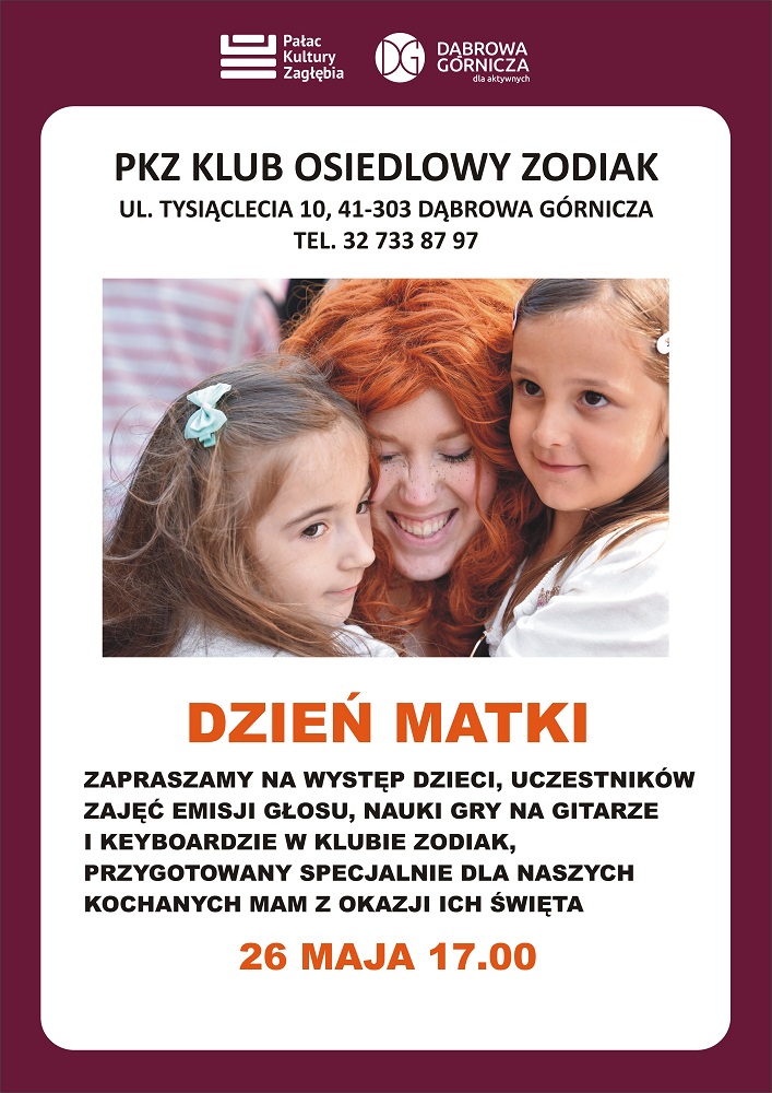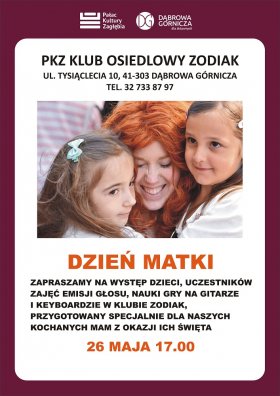 Z okazji Dnia Matki Klub Osiedlowy Zodiak zaprasza na wyjątkowy występ - popis uczestników zajęć emisji głosu, nauki gry na gitarze i keyboardzie. Na pokaz zapraszamy 26 maja o godz. 17:00.