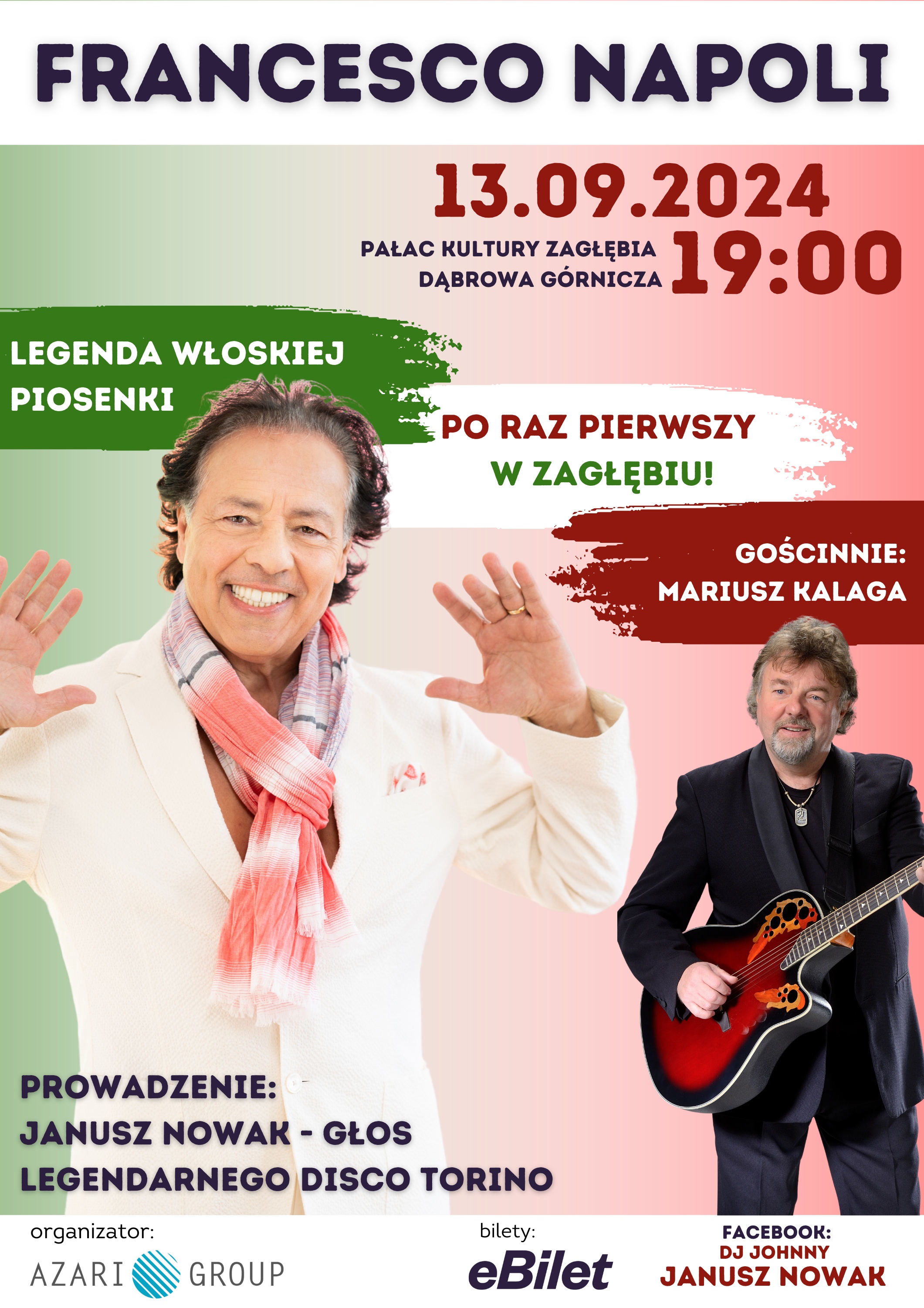 Usłyszycie na żywo wielki przebój Balla Balla, Marina, Buona Sera oraz inne największe hity ze słonecznej Italii. Wrócą wspomnienia, być może nawet pojawią się wzruszenia. Ale to nie wszystko! Jako gość specjalny wystąpi niezwykle popularny, Mariusz Kalaga, a cała sala z pewnością będzie nucić- "Jedna z gwiazd, co Twoje imię ma...". Dodatkową atrakcją będzie konferansjer Janusz Nowak , znany wielu osobom, jako głos legendarnego Disco Torino. To będzie niezapomniany wieczór, na którym nie może Was zabraknąć. Dwóch artystów, dwie godziny wspaniałej zabawy!
