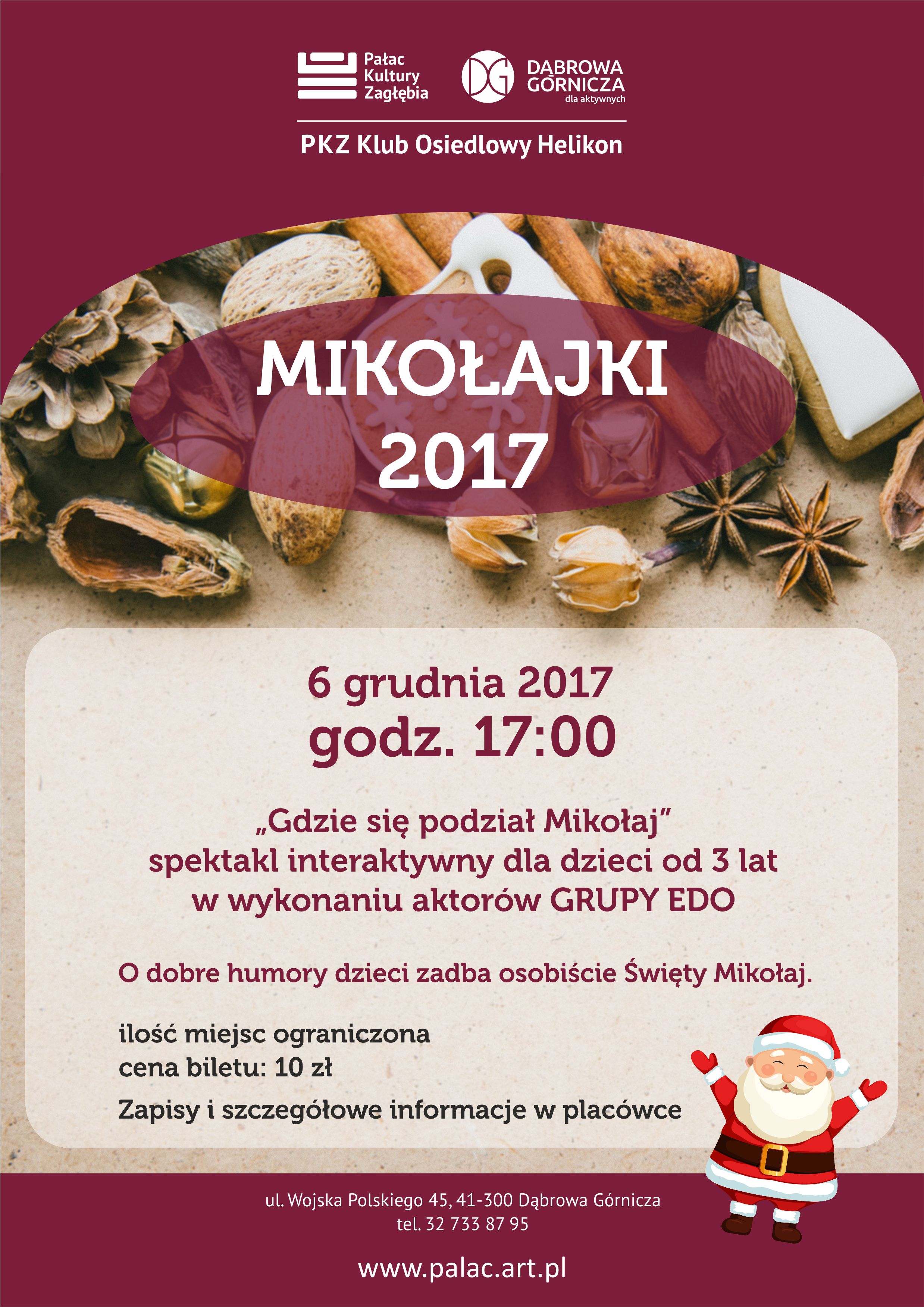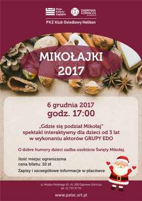 Gdzie się podział Mikołaj? Z taką zagadką zmierzą się dzieci, które 6 grudnia o godz. 17:00 odwiedzą Klub Osiedlowy Helikon. Spektakl interaktywny Gdzie się podział Mikołaj? wykonają aktorzy grupy EDO. Wesołe przedstawienie łączy przyjemne z pożytecznym, bo nie tylko przenosi najmłodszych w magiczny świat fantazji i prawdziwie świąteczną atmosferę, ale także "przemyca" wiele elementów edukacyjnych.