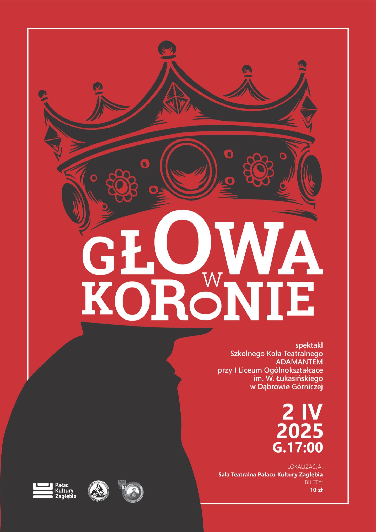 2 kwietnia o 17:00 zapraszamy do Sali Teatralnej Pałacu Kultury Zagłębia na spektakl Głowa w koronie, w wykonaniu Szkolnego Koła Teatralnego ADAMANTEM.