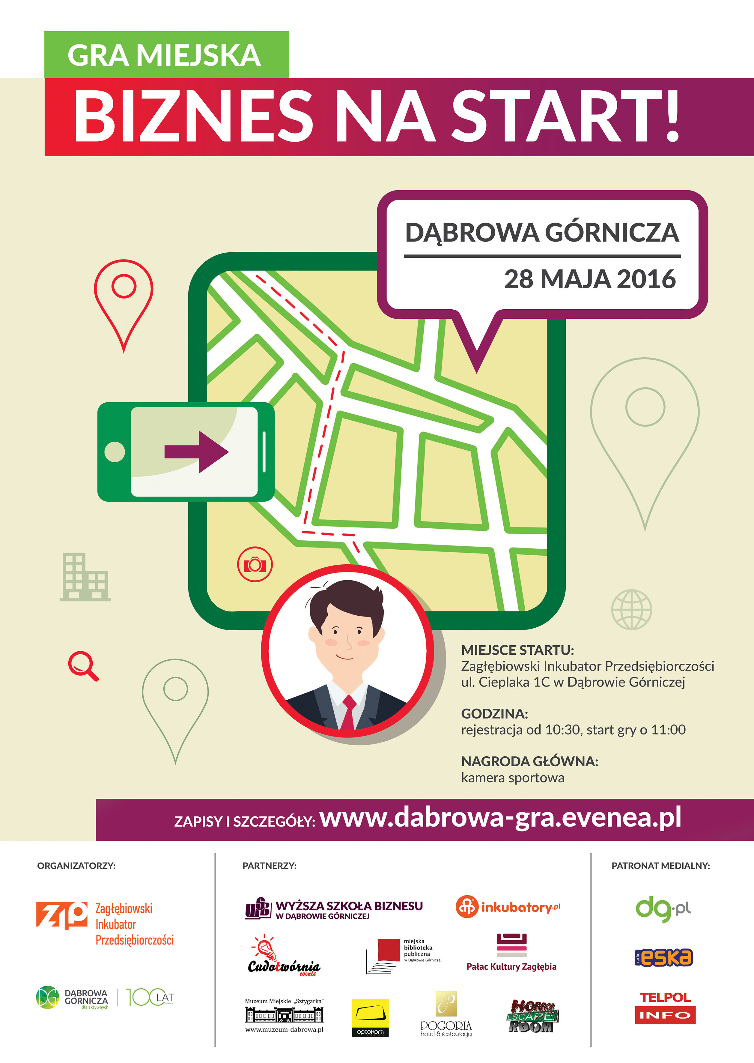 Urząd Miejski w Dąbrowie Górniczej, Wyższa Szkoła Biznesu oraz partner wydarzenia – Pałac Kultury Zagłębia, mają przyjemność zaprosić wszystkich mieszkańców miasta do fantastycznej zabawy podczas gry miejskiej „Biznes na start".