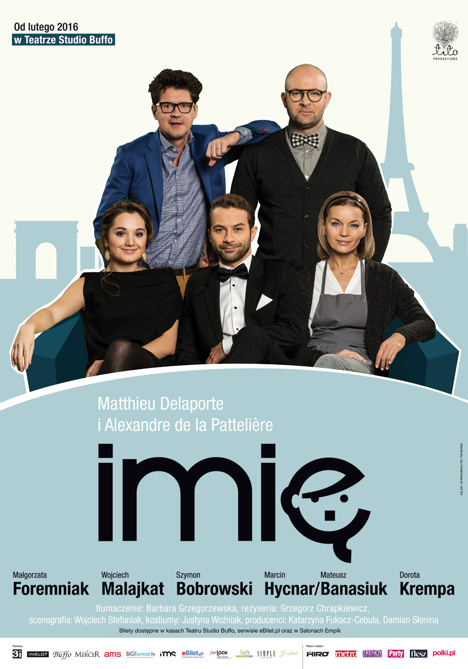 Nakręcony w 2013 roku film otrzymał dwa Cezary oraz trzy nominacje (w tym za najlepszy scenariusz adaptowany). Dobrze napisane, dowcipne dialogi i wyraziste postaci, to komediowe atuty "Imienia", sztuki jednocześnie niepozbawionej refleksji. Spektakl "Imię" wyprodukowany w 2016 roku, dziś zaliczany jest do najlepszych polskich produkcji. Akcja rozgrywa się w ciągu jednego wieczoru, podczas kolacji wyprawianej przez profesora literatury Pierre'a (Szymon Bobrowski) i jego żonę Elisabeth (Małgorzata Foremniak) w ich paryskim mieszkaniu. Zaproszeni goście, to przyjaciel domu, puzonista Claude (Marcin Hycnar / Mateusz Banasiuk), brat Elisabeth, błyskotliwy przedsiębiorca Vincent (Wojciech Malajkat) oraz jego dużo młodsza, ciężarna partnerka Anna (Dorota Krempa). W tym gronie przebieg spotkania wydawał się doskonale przewidywalny. Jednak tym razem typowe, drobne sprzeczki przerodzą się w prawdziwą bitwę. A całe zamieszanie wywoła niewinne z pozoru pytanie: Czy macie już jakiś pomysł na imię?