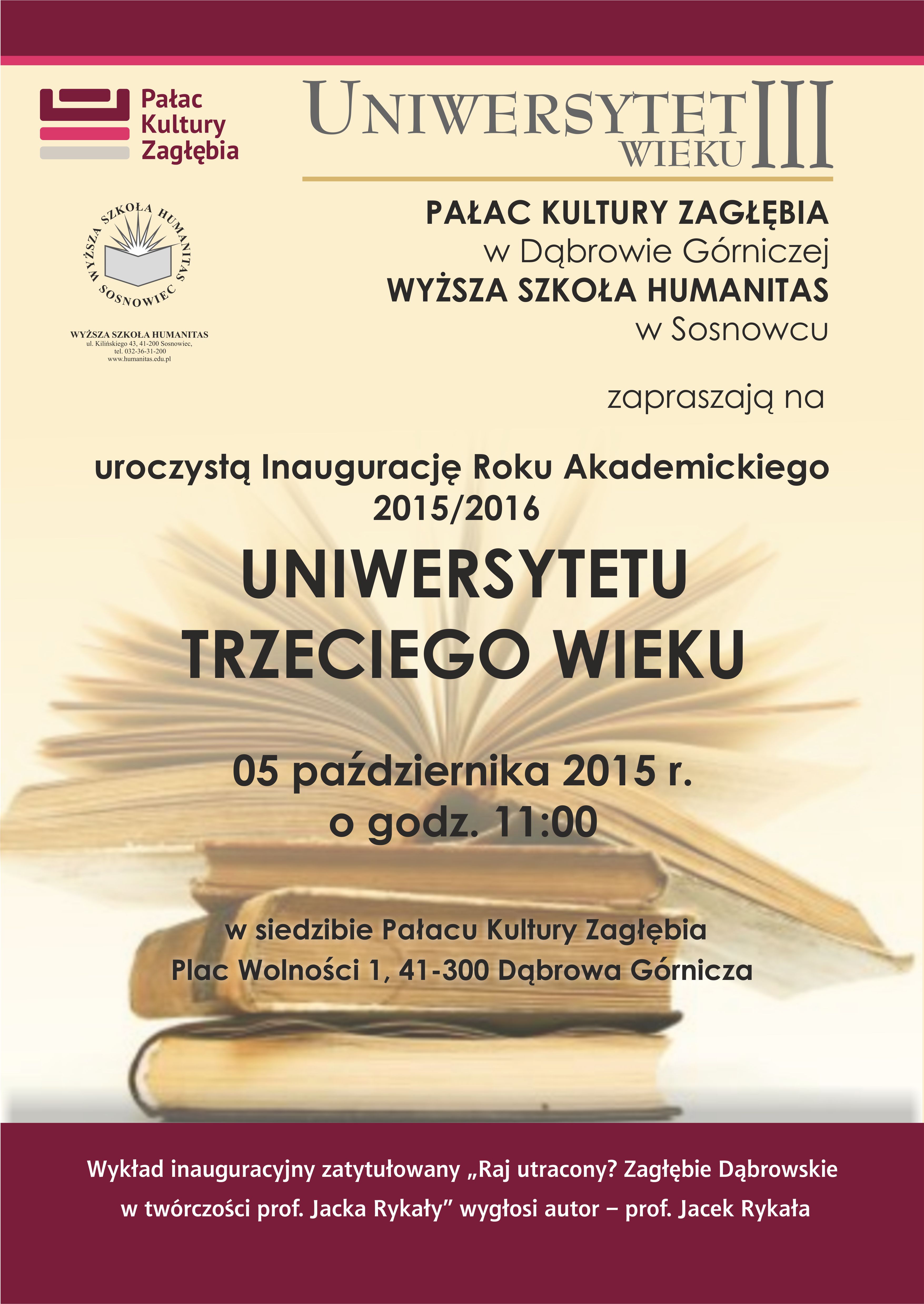 5 października 2015 r. (poniedziałek) o godzinie 11.00 zapraszamy na uroczystą inaugurację roku akademickiego 2015/2016, która odbędzie się w sali 218 (I piętro) w Pałacu Kultury Zagłębia. W programie wykład pt.: „Raj utracony? Zagłębie Dąbrowskie w twórczości prof. Jacka Rykały” otwierający kolejny cykl uniwersyteckich zajęć, wygłosi autor – prof. Jacek Rykała.