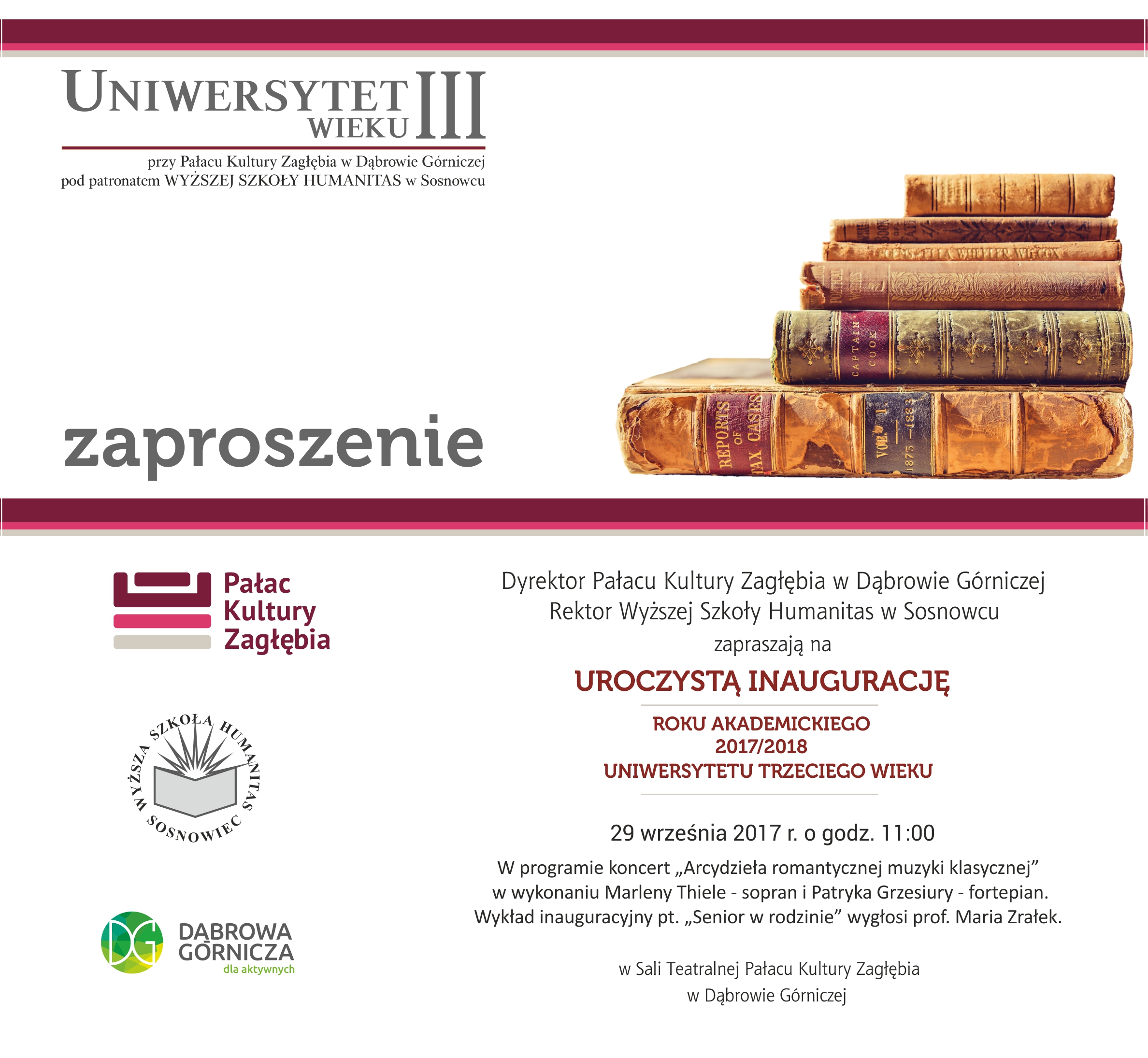Uroczysta Inauguracja Roku Akademickiego 2017/2018 odbędzie się w piątek, 29 września 2017 r. o godz. 11:00 w Sali Teatralnej Pałacu Kultury Zagłębia. W programie koncert "Arcydzieła romantycznej muzyki klasycznej" w wykonaniu Marleny Thiele (sopran) i Patryka Grzesiury (fortepian) oraz wykład pt.: "Senior w rodzinie", otwierający kolejny cykl uniwersyteckich zajęć, który wygłosi prof. Maria Zrałek. Podczas uroczystości nastąpi również zaprzysiężenie słuchaczy I–go roku.