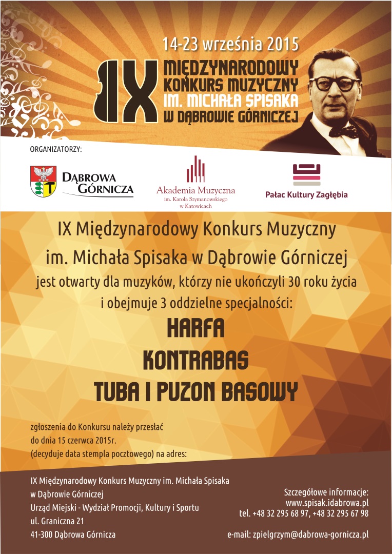 W dniach 14 – 23 września 2015 r., Dąbrowa Górnicza już po raz dziewiąty będzie gospodarzem Międzynarodowego Konkursu Muzycznego im. Michała Spisaka.