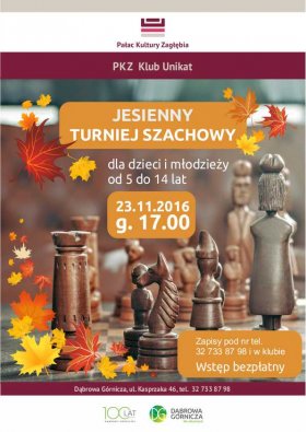Serdecznie zapraszamy dzieci i młodzież do lat 14, do Klubu Unikat na Jesienny Turniej Szachowy, który odbędzie się 23 listopada 2015 r., o godzinie 17:00. Gwarantujemy dobrą zabawę w towarzystwie królów i królowych :)