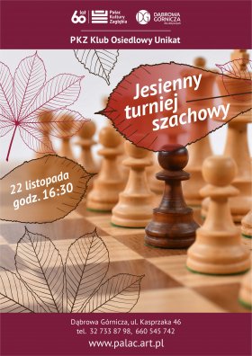 22 listopada od godziny 16:30 w Klubie Osiedlowym Unikat odbędzie się Jesienny Turniej Szachowy. Udział w nim mogą wziać dzieci w dwóch kategoriach wiekowych - do lat 8 oraz od 9 do 15 lat. Dla zdobywców trzech pierwszych miejsc przewidziane są nagrody rzeczowe.