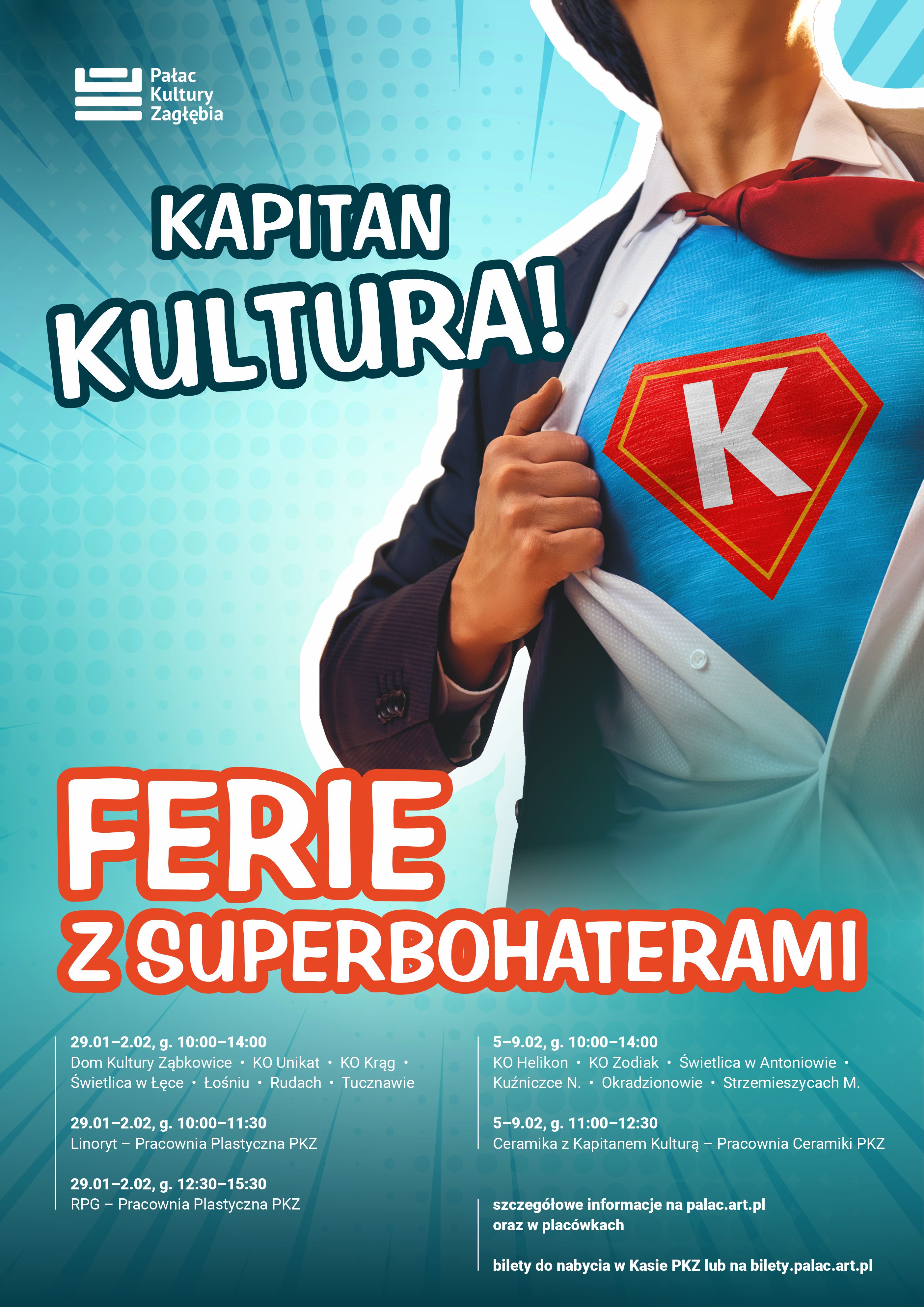 Serdecznie zapraszamy na Artystyczne ferie z PKZ pod hasłem Kapitan Kultura - ferie z superbohaterami. Harmonogram zajęć w poszczególnych placówkach znajduje się poniżej.