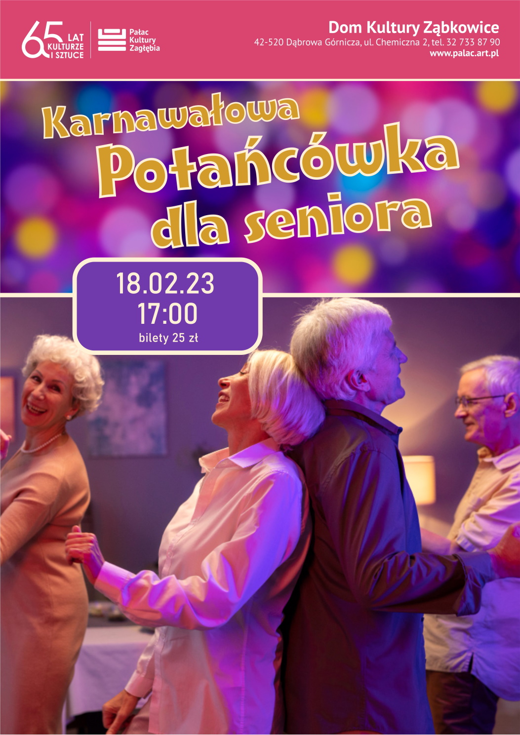 18 lutego o 17:00 zapraszamy wszystkich seniorów na kolejną z cyklu Potańcówkę dla seniora w Domu Kultury Ząbkowice - tym razem w klimacie karnawału!