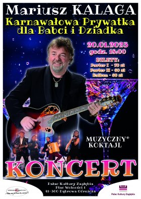 Jeśli chcielibyście Państwo mile spędzić czas i posłuchać melodyjnych piosenek, uśmiechnąć się słuchając inteligentnego humoru i zabawnych dialogów z publicznością, jednocześnie pośpiewać znane i lubiane szlagiery, zapraszamy Was do Pałacu Kultury Zagłębia 20 stycznia o 18:00 na koncert Karnawałowa prywatka dla babci i dziadka na którym wystąpi – Mariusz Kalaga z zespołem.
