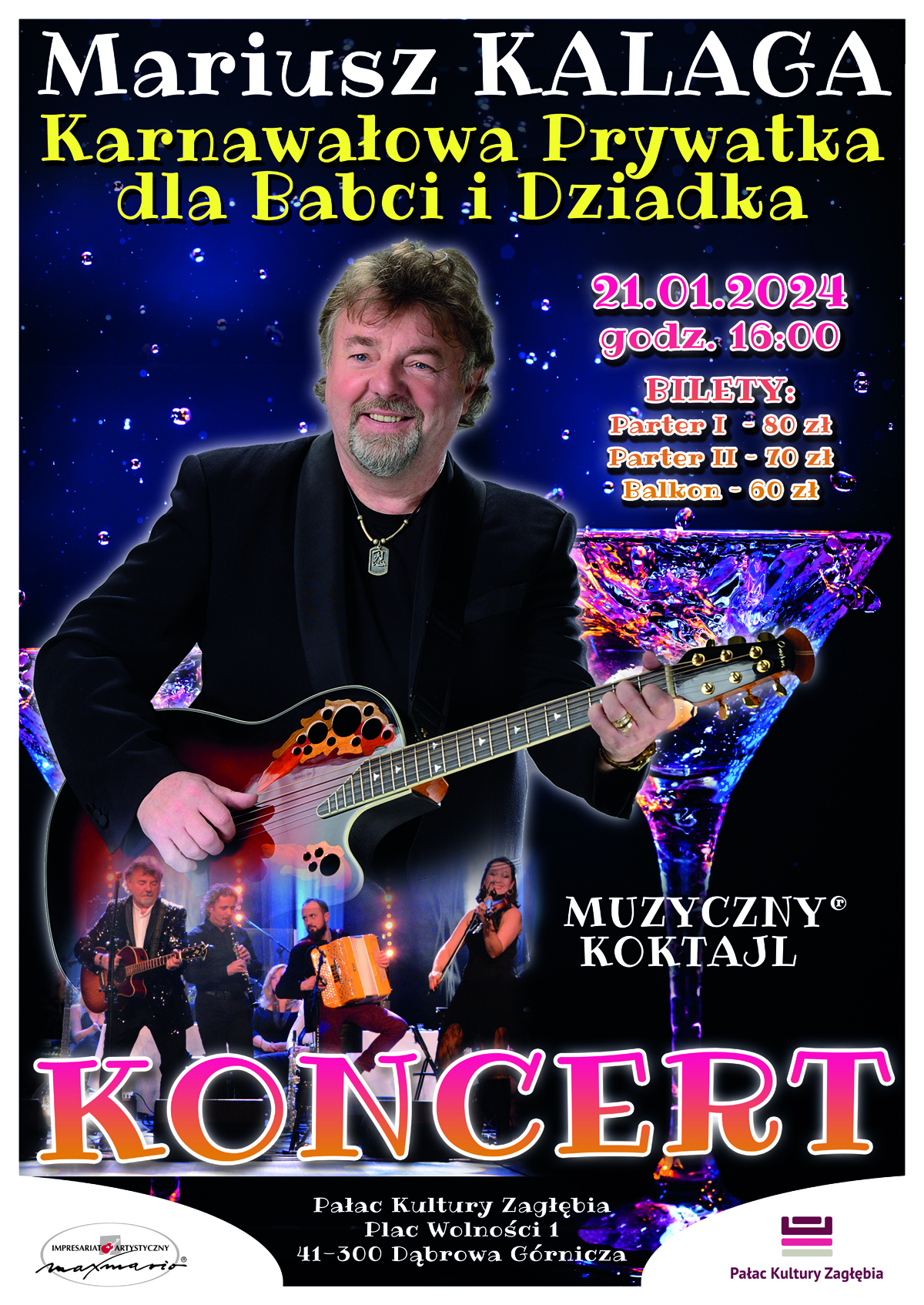 Jeśli chcielibyście Państwo mile spędzić czas i posłuchać melodyjnych piosenek, uśmiechnąć się słuchając inteligentnego humoru i zabawnych dialogów z publicznością, jednocześnie pośpiewać znane i lubiane szlagiery, zapraszamy Was do Pałacu Kultury Zagłębia 21 stycznia o 16:00 na koncert Karnawałowa prywatka dla babci i dziadka na którym wystąpi – Mariusz Kalaga z zespołem.