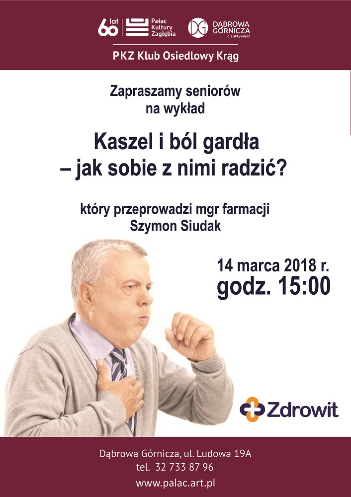 Klub Osiedlowy Krąg i Apteka Zdrowit zapraszają seniorów na wykład Kaszel i ból gardła - jak sobie z nimi radzić? Prezentacji dokona magister farmacji Szymon Siudak. Dodatkowe informacje w klubie. Wykład odbędzie się 14 marca o godz. 15:00.