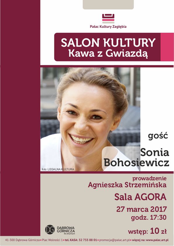 Ostatni raz gościła w Pałacu Kultury Zagłębia podczas Festiwalu Kultury ZagłębieWood w 2015 roku, podczas którego wystąpiła w monodramie Chodź ze mną do łóżka. Choć na co dzień widzimy ją na mniejszych - szklanych oraz większych - kinowych ekranach, to 27 marca o godzinie 18:00, będziemy mieli okazję zobaczyć ją na żywo, a nawet napić się z nią kawy - Sonia Bohosiewicz. Znana i lubiana aktorka będzie gościem drugiej w tym roku Kawy z Gwiazdą w Sali Agora Duża.