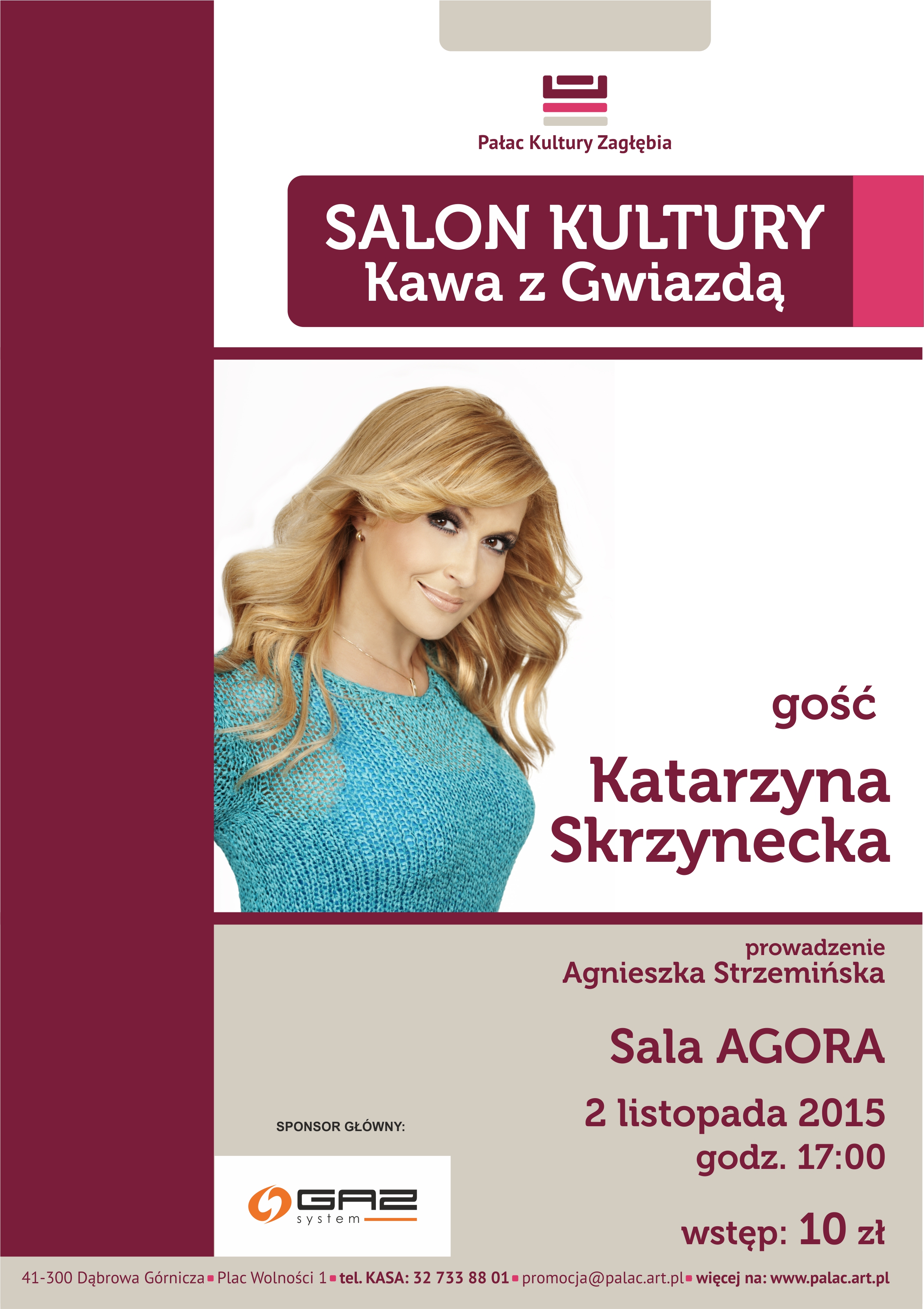 Gościem najbliższego spotkania z cyklu „Salonu kultury. Kawy z Gwiazdą” będzie Katarzyna Skrzynecka – aktorka, wokalistka, autorka tekstów, kompozytor. Spotkanie poprowadzi Agnieszka Strzemińska – dziennikarka Radia Katowice.