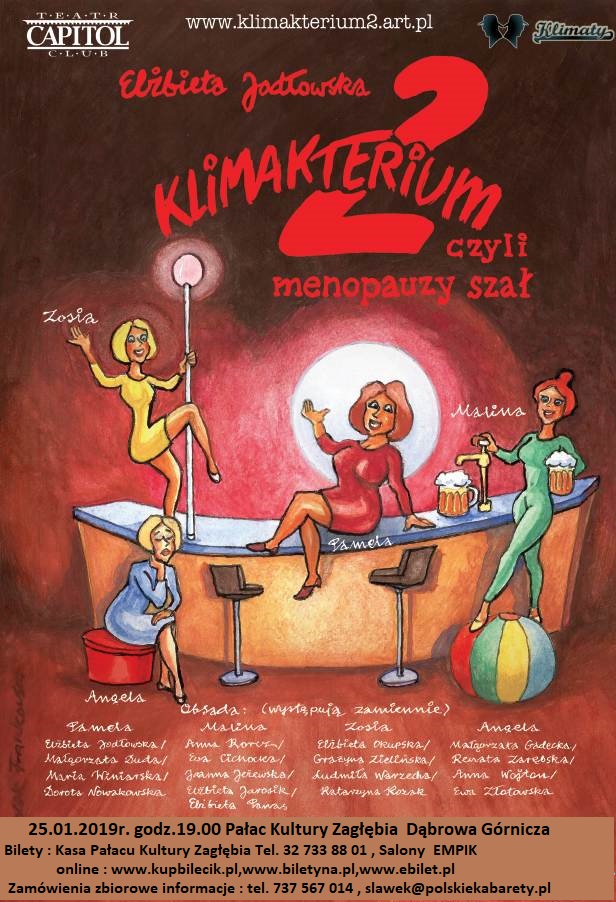 Wydawało nam się, że o klimakterium powiedzieliśmy już wszystko... Myliliśmy się! Elżbieta Jodłowska powraca z nowym hitem! Klimakterium 2, czyli Menopauzy Szał powstało na wyraźną prośbę publiczności, która chciała poznać dalsze losy bohaterek - już nie młodych, ale jakże młodych. Spektakl na deskach Pałacu Kultury Zagłębia 25 stycznia 2019 r. o 19:00!
