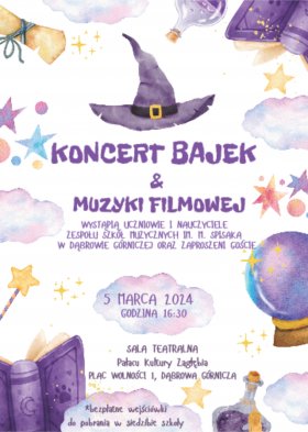 5 marca o godz. 16:30 zapraszamy na Koncert bajek i muzyki filmowej w wykonaniu uczniów i nauczycieli Zespołu Szkół Muzycznych im. Michała Spisaka w Dąbrowie Górniczej.