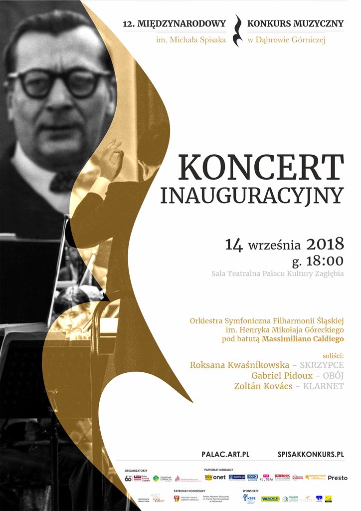 Jak co roku, 14 września, w dzień urodzin najsłynniejszego dąbrowskiego kompozytora, patrona konkursu, odbędzie się koncert, który zainauguruje 12. Międzynarodowy Konkurs Muzyczny im. Michała Spisaka w Dąbrowie Górniczej. O godzinie 18:00 na dużej scenie Pałacu Kultury Zagłębia wystąpi Filharmonia Śląska im. Henryka Mikołaja Góreckiego pod batutą Massimiliano Caldiego wraz z zaproszonymi solistami: dr hab. Zoltánem Kovács’em (klarnet) oraz laureatami ubiegłorocznej edycji konkursu - Roksaną Kwaśnikowską (skrzypce) i Gabrielem Pidoux (obój). Koncert poprowadzi Violetta Rotter-Kozera.
