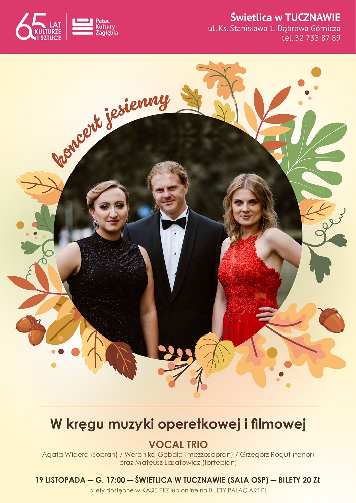 W kręgu muzyki operetkowej i filmowej to tytuł niezwykłego, jesiennego koncertu wypełnionego ariami, duetami oraz muzyką filmową w wykonaniu lokalnych artystów. Vocal Trio, bo o nich mowa, to soliści znani na scenach i festiwalach w całej Polsce, w większości pochodzący z Zagłębia Dąbrowskiego. Ich głosy rozbrzmią 19 listopada o godzinie 17.00, w Świetlicy w Tucznawie, przy akompaniamencie fortepianu. Zapraszamy Państwa serdecznie, na spędzenie listopadowego, niedzielnego popołudnia przy dźwiękach muzyki, która z pewnością na długo pozostanie w pamięci.