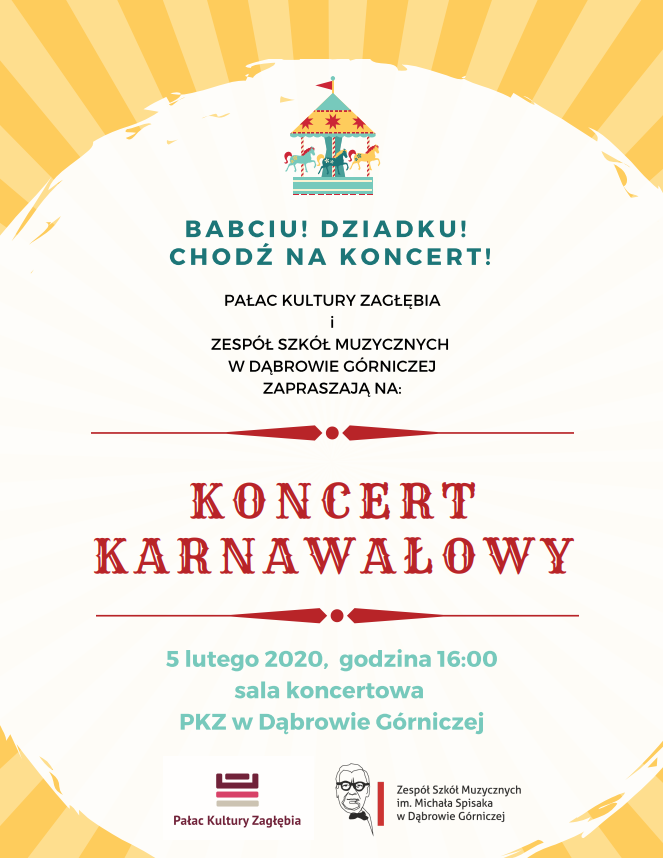5 lutego o g. 16:00 w Sali Teatralnej Pałacu Kultury Zagłębia odbędzie się Koncert Karnawałowy z okazji Dnia Babci i Dziadka, który zaprezentują uczniowie oraz nauczyciele Zespołu Szkół Muzycznych im. Michała Spisaka w Dąbrowie Górniczej!