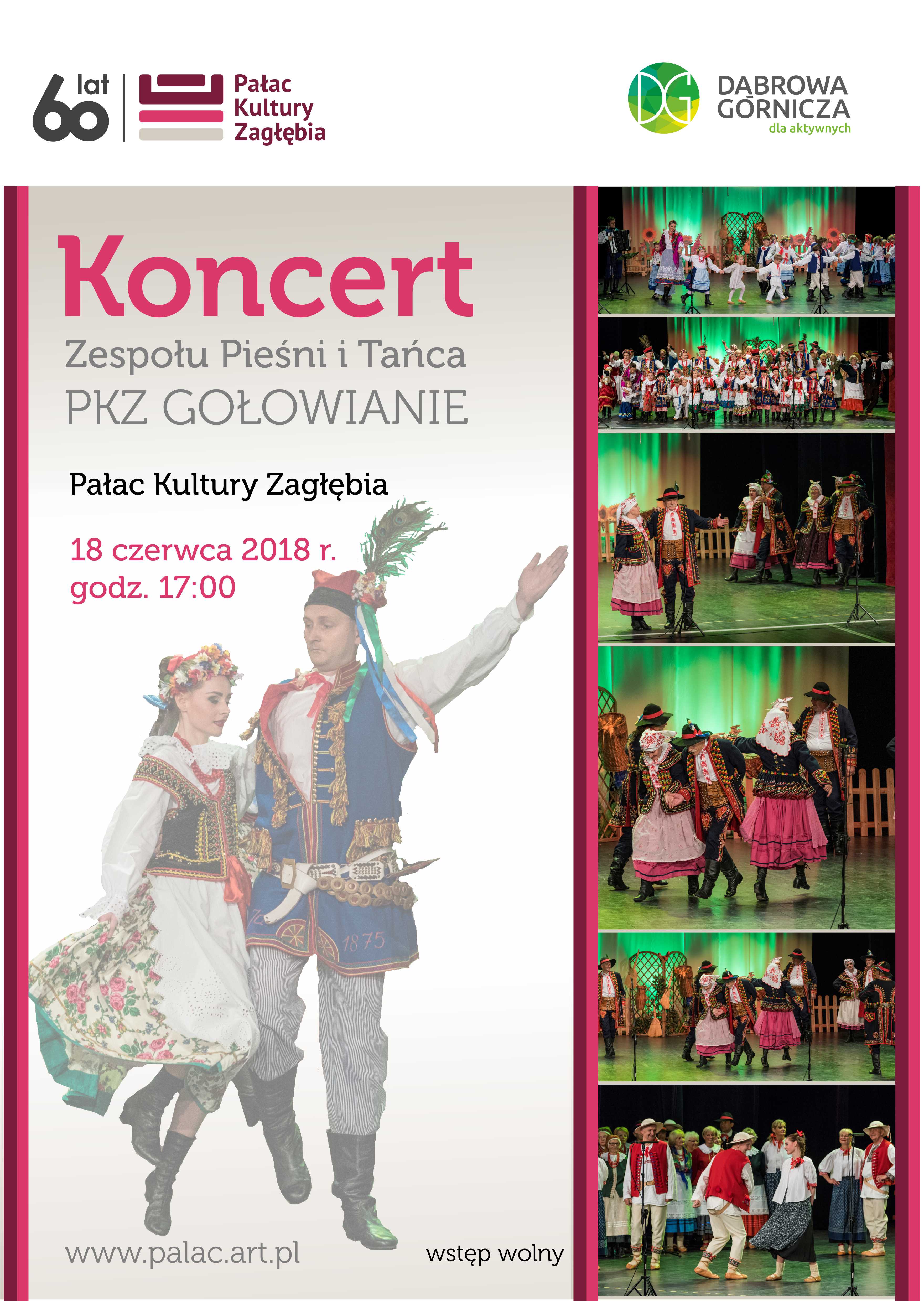 18 czerwca o godzinie 17:00 w Sali Teatralnej Pałacu Kultury Zagłębia będziemy podziwiać tańce i śpiewy z różnych regionów Polski, a wszystko to w wykonaniu lokalnego Zespołu Pieśni i Tańca PKZ Gołowianie.