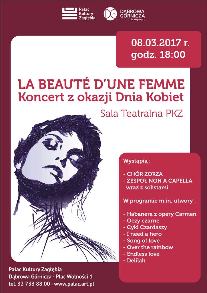Piękność jest pierwszym darem, który natura daje kobiecie – mawiał Feliks Feldheim. Kobieta jest wzorem piękna i cnót, dlatego z okazji święta wszystkich kobiet, pragniemy zaprosić Państwa na niezwykły koncert zatytułowany La beauté d'une femme, w wykonaniu Chóru Zorza pod kierownictwem Elżbiety Kaźmierskiej oraz zespołu Non a Capella. Towarzyszyć im będą znani, utalentowani soliści i intrumentaliści. Koncert z utworami poświęconymi płci pięknej odbędzie się 8 marca o godzinie 18:00.