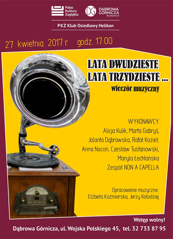 Koncert ten, ze względu na zbliżające się święta majowe, jest swoistym hołdem, jaki wykonawcy tego wieczoru pragną oddać artystom tworzącym w okresie międzywojennym - epoki rozbrzmiewającej rytmem charlestona, foxtrota, swingu i jazzu. Epoki, która złapała pierwszy oddech wolności buntując się przeciwko wartościom minionych lat okupacji. Podczas tego wieczoru usłyszymy m.in. utwory z polskich filmów muzycznych w wykonaniu solistów związanych z Klubem Osiedlowym Helikon. Całość została przygotowana przez Elżbietę Kaźmierską i Jerzego Kołodzieja. Koncert odbędzie się 27 kwietnia o godz. 17:00.