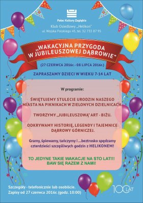 Wyjątkowe lato w wyjątkowym mieście - zaproszenie adresowane do młodych mieszkańców Dąbrowy Górniczej, pragnących przez udział we wspólnej wakacyjnej przygodzie, włączyć się aktywnie do atrakcji związanych z jubileuszem stulecia nadania praw miejskich Dąbrowie Górniczej.