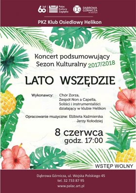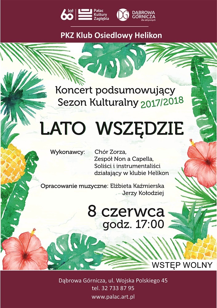 Klub Osiedlowy Helikon zaprasza wszystkich swoich fanów na koncert, który odbędzie się 8 czerwca o godz. 17:00. Będzie to wydarzenie muzyczne podsumowujące sezon artystyczny 2017/2018, dlatego wezmą w nim udział 3 pokolenia wykonawców, którzy zaprezentują różne style muzyczne, począwszy od operetki po muzykę pop czy folk. Całość będzie utrzymana w bardzo pogodnym, letnim klimacie, dlatego będzie można usłyszeć takie przeboje jak Jesteśmy na wczasach, Na plaży czy Dziewczyna ratownika. Koncert przygotowali: E. Kaźmierska i J. Kołodziej.
