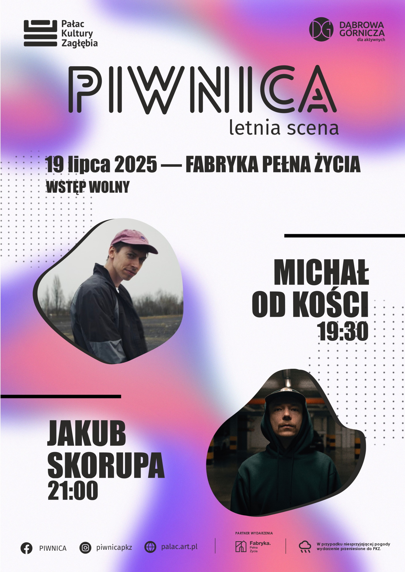 19 lipca o 19:30 w Fabryce Pełnej Życia odbędzie się podwójny koncert, promujący pałacowy cykl muzyki alternatywnej PIWNICA, podczas którego wystąpią o 19:30 Michał od kości oraz o 21:00 Jakub Skorupa. Wydarzenie odbywa się w ramach Dąbrowskiej Akcji Lato z Pałacem Kultury Zagłębia.