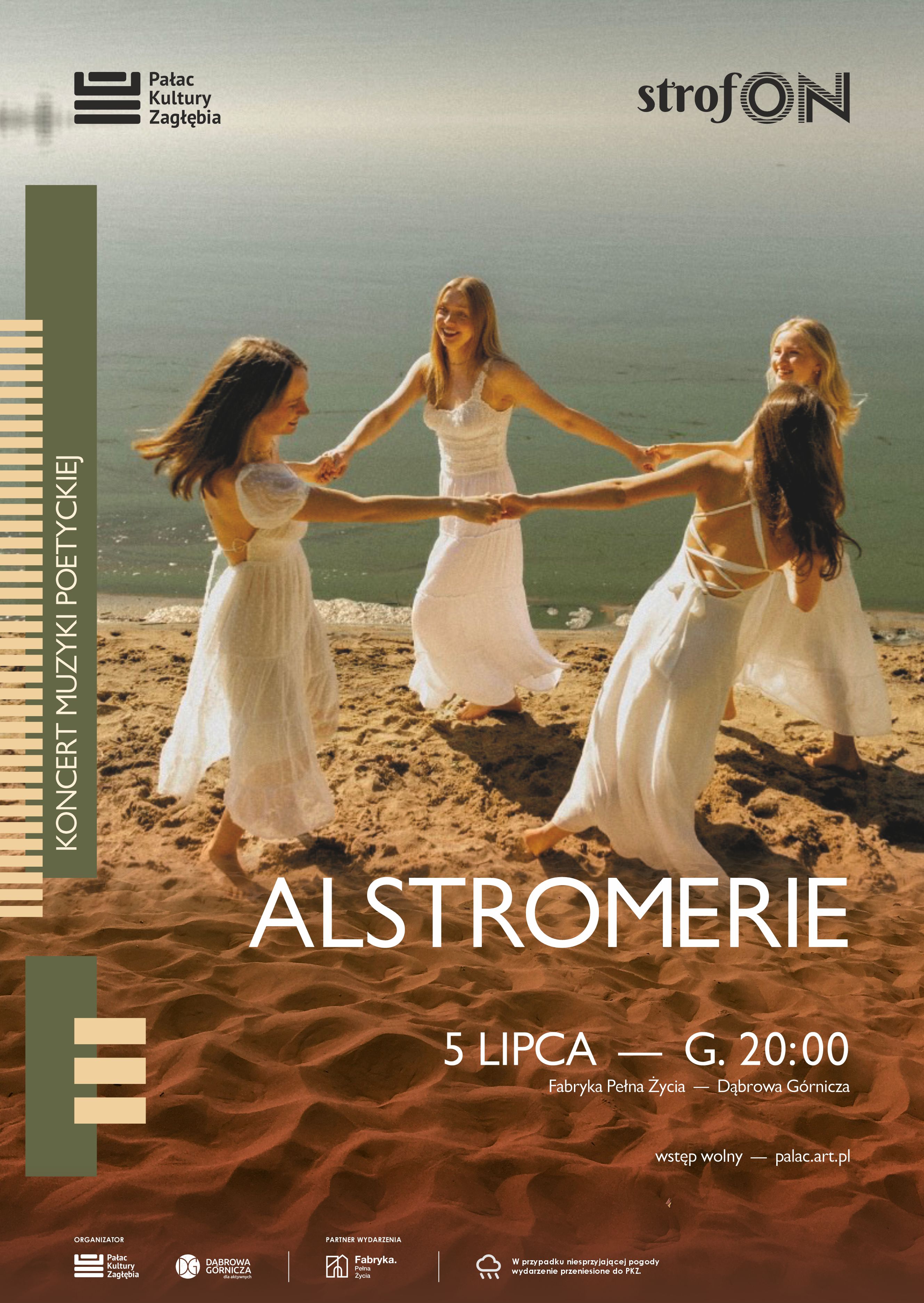 5 lipca o 20:00 w Fabryce Pełnej Życia odbędzie się pierwszy z plenerowych koncertów, promujących pałacowe cykle muzyczne. Tego dnia na fabrycznej scenie zobaczymy i usłyszymy zespół Alstromerie, który wystąpi w ramach plenerowej odsłony cyklu muzyki poetyckiej StrofON! Wydarzenie odbędzie się w ramach Dąbrowskiej Akcji Lato z Pałacem Kultury Zagłębia.
