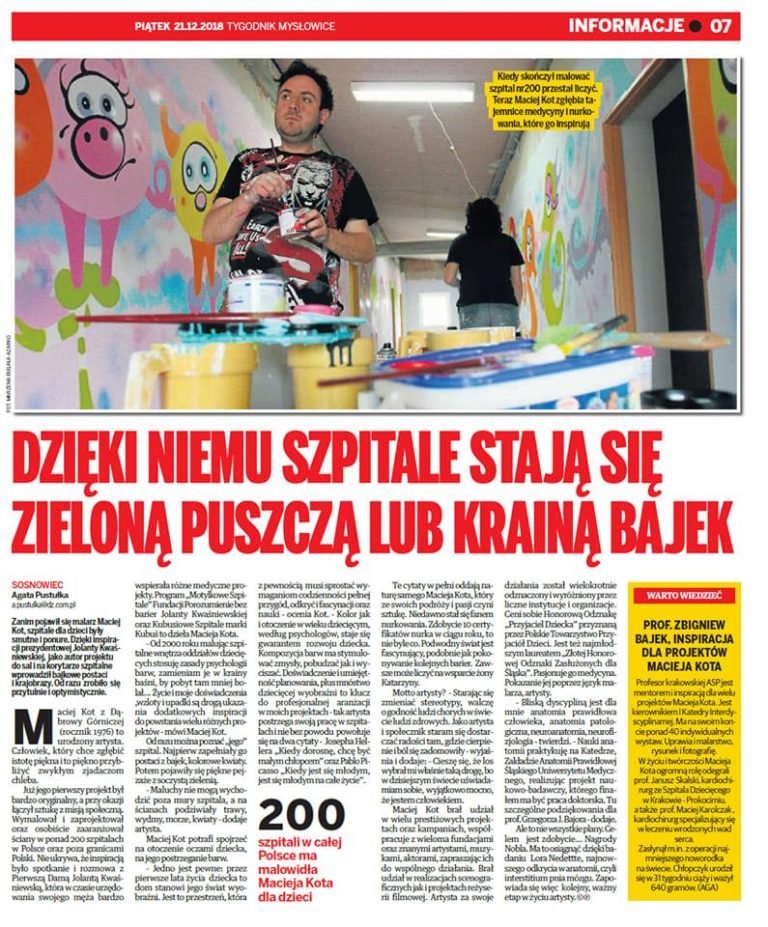 Maciej Kot to artysta, któremu dzieci zawdzięczają kolorowe bajkowe szpitale. Szarość w szpitalach zaczął zmieniać w 2000 roku, kiedy to rozpoczął program „Motylkowe Szpitale” Fundacji "Porozumienie bez barier" Jolanty Kwaśniewskiej. Zaprojektował, osobiście zaaranżował i wymalował ściany w ponad 200 szpitalach, szkołach i przedszkolach w całej Polsce. Był długoletnim realizatorem projektu „Kubusiowe Szpitale”  i „Kubusiowe Szkoły” marki KUBUŚ. Realizował i tworzył projekty dla dzieci również poza granicami kraju. Był Rzecznikiem Prasowym oraz Konsultantem ds. kreatywności i kultury organizacyjnej Mazowieckiego Szpitala Dziecięcego im. prof. Bogdanowicza w Warszawie.