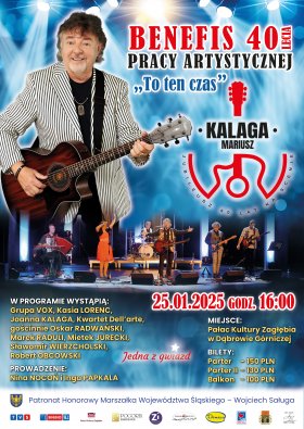 25 stycznia o godz. 16:00 w Sali Teatralnej odbędzie się wyjątkowy koncert z okazji 40 lecia pracy artystycznej Mariusza Kalagi ,,To ten czas" z zespołem: Marzena Woźniak, Jacek Dobrzański, Grzegorz Imielski, Aleksander Woźniak, Dariusz Bartosiewicz, Sebastian Maciejewski oraz Mariusz Majda.