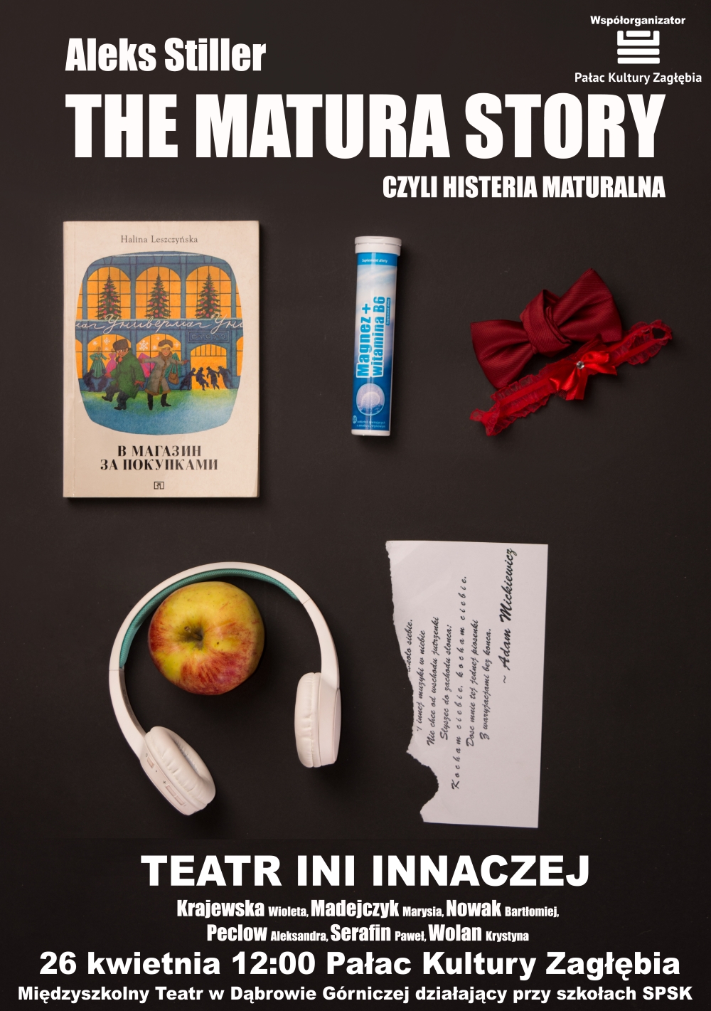 Czyim synem był Pan Tadeusz? O czym mówi prawo Hardy'ego Weinberga? I dlaczego tak ważna jest kinematografia Czechosłowacka, a przedawkowanie magnezu skutkuje wyjazdem do Mongolii? Na te oraz inne pytania zaskakujących odpowiedzi udzielą maturzyści z jednej z zagłębiowskich szkół, czyli bohaterowie spektaklu The Matura Story. Dumna Olga, wyluzowana Paula, znerwicowana Ela, zakochani w sobie Marysia i Tadek oraz zamyślony Adaś - aby zdać maturę nie cofną się przed niczym. Nie straszne będzie im zjedzenie książki, noszenie cudzej bielizny, a nawet chwilowa zmiana orientacji seksualnej. Wszystko po to, by zdobyć wyśniony klucz maturalny. Dziejąca się między snem a jawą historia to jednoaktowa komedia z podwójnym dnem, a nawet podwójnym kluczem... Spektakl The Matura Story, czyli histerie maturalne adresowany jest do wszystkich, którzy zdawali, zdają bądź będą zdawać!