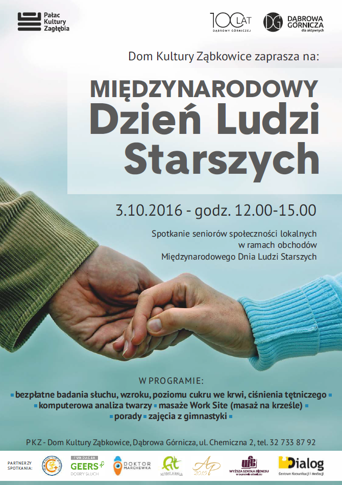 PKZ Dom Kultury Ząbkowice zaprasza wszystkich seniorów społeczności lokalnych na Międzynarodowy Dzień Ludzi Starszych, który odbędzie się w poniedziałek 3 października 2016 r., w godzinach 12.00 – 15.00.