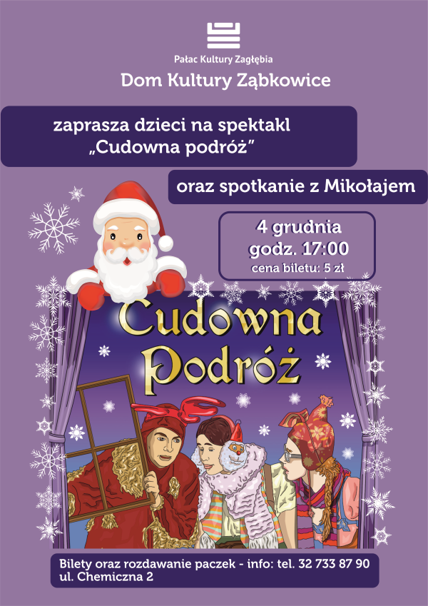 Z okazji Mikołajek Dom Kultury Ząbkowice zaprasza na spektakl „Cudowna podróż ” oraz spotkanie z Mikołajem.