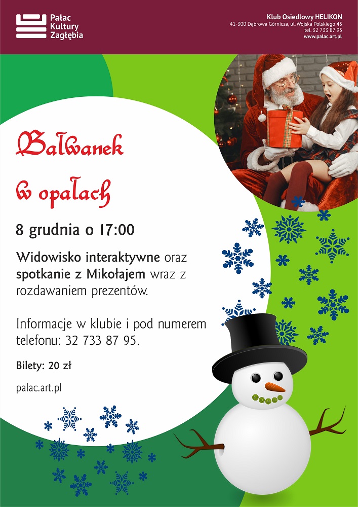 Ho, ho, ho! Jak co roku, tak i w tym, Klub Helikon odwiedzi Święty Mikołaj. Spotkanie dzieci z Mikołajem poprzedzi widowisko interaktywne "Bałwanek w opałach", czyli nastrojowa, zimowa opowieść o zabawnym bałwanku i jego rozterkach. W tle święta, ferie, radość i wypoczynek a zarazem spojrzenie na brak empatii. Dobra zabawa, zaskakujący finał i morał.