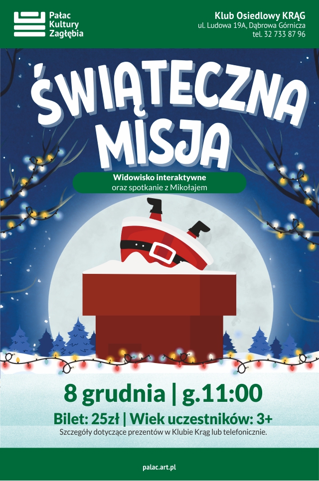 8 grudnia o 11:00 zapraszamy do Klubu Osiedlowego Krąg na widowisko interaktywne dla dzieci pt. Świąteczna misja, po którym dzieciaki spotkają się ze Świętym Mikołajem!