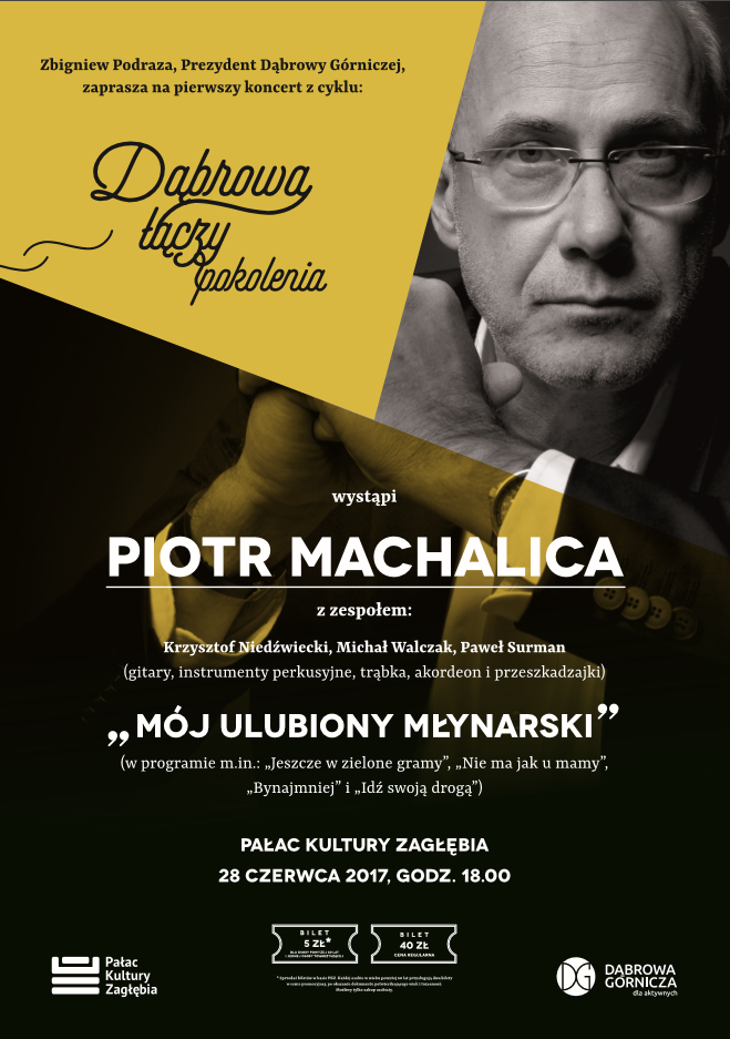 Muzyka potrafi obudzić w nas pokłady młodości, posiada zdolność do przywracania starych i tworzenia nowych wspomnień, dlatego powstał cykl koncertów Dąbrowa łączy pokolenia. Cykl skierowany do wszystkich, ale ze szczególnym wyróżnieniem seniorów, którzy będą mieli możliwość zaproszenia na koncert dzieci i wnuki. Stanie się tak, dzięki specjalnej cenie biletu, która dla seniora będzie wynosić jedynie 5 zł i dodatkowe 5 zł, jeśli senior zdecyduje się iść z osobą towarzyszącą. Pierwszą okazją do tego będzie recital Mój ulubiony Młynarski w wykonaniu Piotra Machalicy 28 czerwca o 18:00.