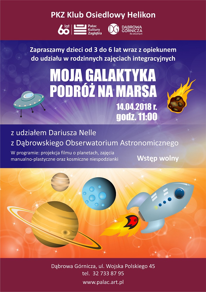 Moja galaktyka - podróż na Marsa. Zajęcia dla dzieci w wieku przedszkolnym wraz z rodzicami, 14 kwietnia o godz. 11:00. Wstęp wolny po uprzednim kontakcie, osobiście lub telefonicznie.