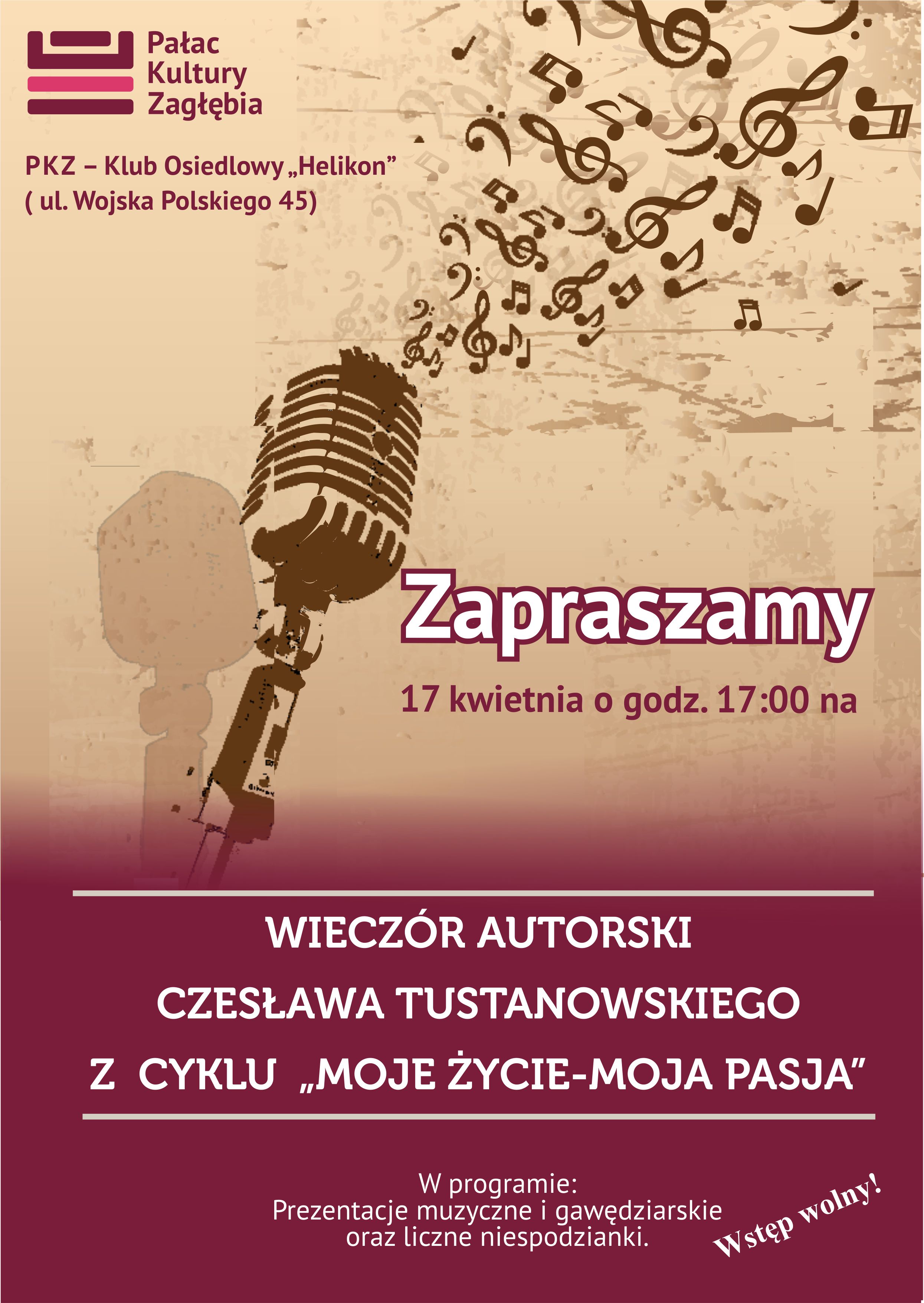 Serdecznie zapraszamy 17 kwietnia 2015 r.do Klubu Osiedlowego Helikon na wieczór autorski Czesława Tustanowskiego.