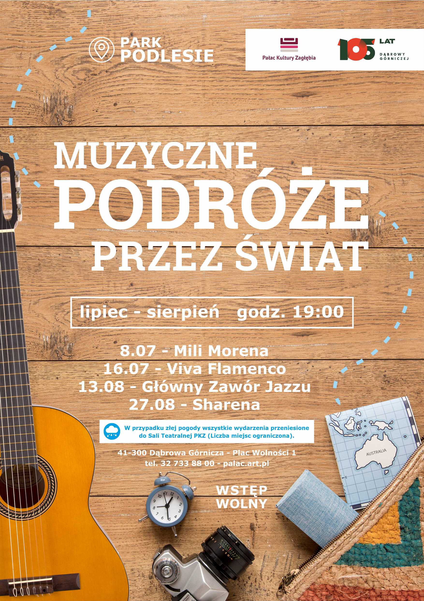 Muzyczne podróże to nowy i zarazem pierwszy cykl wydarzeń w Parku Podlesie po jego modernizacji, organizowany przez Pałac Kultury Zagłębia oraz miasto Dąbrowa Górnicza. W odnowionej, pełnej uroku, sprzyjającej wypoczynkowi na świeżym powietrzu przestrzeni usłyszmy muzykę z różnych zakątków globu. Wybierz się w podróż do świata swingu, jazzu, flamenco i muzyki folkowej, która gwarantuje letnie uwolnienie zmysłów!